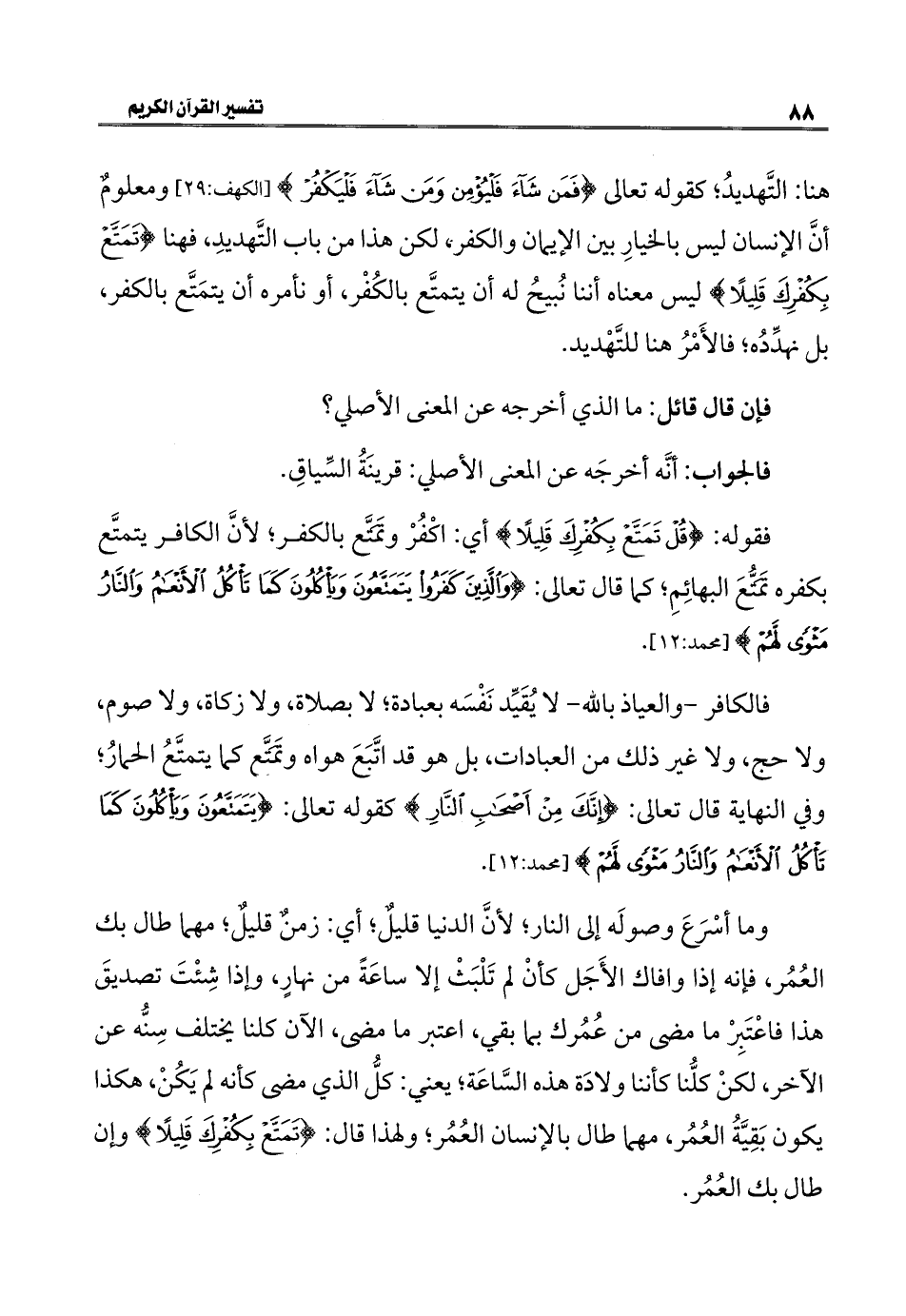 فقوله: {قُلْ تَمَتَّعْ بِكُفْرِكَ قَلِيلًا} أي: اكْفُرْ وتَمَتَّع بالكفر؛ لأنَّ الكافر يتمتَّع بكفره تَمَتُّعَ البهائِمِ؛ كما قال تعالى: {وَالَّذِينَ كَفَرُوا يَتَمَتَّعُونَ وَيَأْكُلُونَ كَمَا تَأْكُلُ الْأَنْعَامُ وَالنَّارُ مَثْوًى لَهُمْ} [محمد: ١٢].