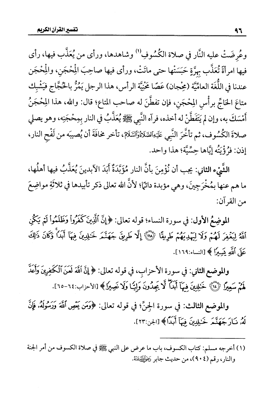 (١) أخرجه مسلم: كتاب الكسوف، باب ما عرض على النبي - صلى الله عليه وسلم - في صلاة الكسوف من أمر الجنة والنار، رقم (٩٠٤)، من حديث جابر - رضي الله عنه -.