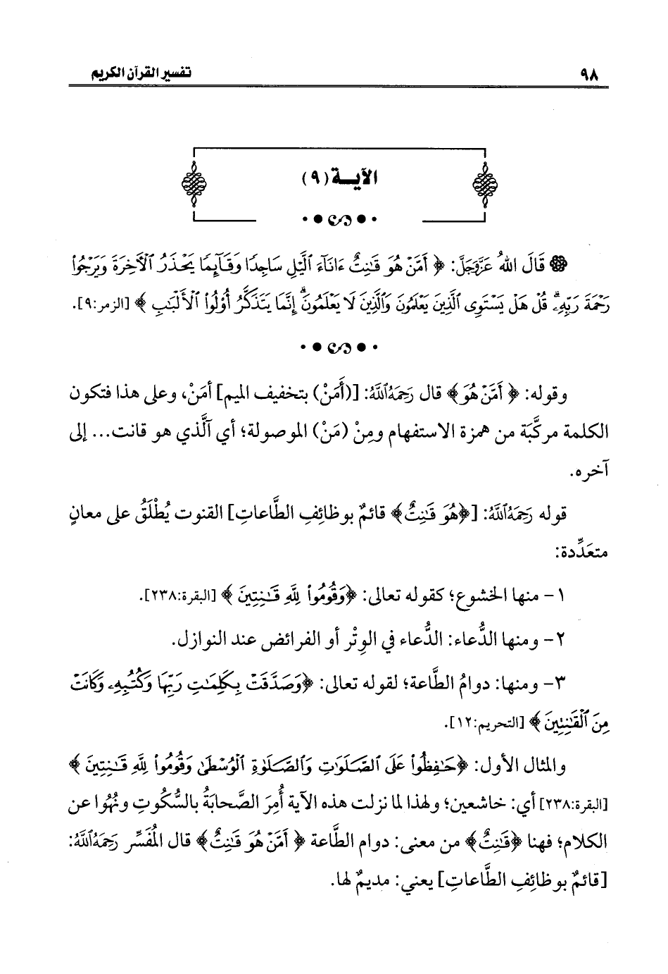 والمثال الأول: {حَافِظُوا عَلَى الصَّلَوَاتِ وَالصَّلَاةِ الْوُسْطَى وَقُومُوا لِلَّهِ قَانِتِينَ} [البقرة: ٢٣٨] أي: خاشعين؛ ولهذا لما نزلت هذه الآية أُمِرَ الصَّحابَةُ بالسُّكُوتِ ونُهُوا عن الكلام؛ فهنا {قَانِتٌ} من معنى: دوام الطَّاعة {أَمَّنْ هُوَ قَانِتٌ} قال المُفَسِّر رَحِمَهُ اللهُ: [قائمٌ بوظائِفِ الطَّاعاتِ] يعني: مديمٌ لها.