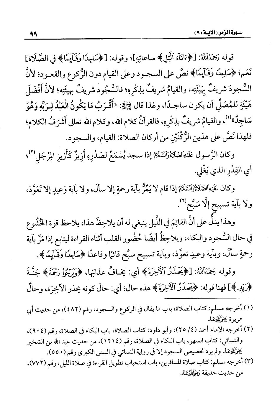 قوله رَحِمَهُ اللهُ: [{آنَاءَ اللَّيْلِ} ساعاتِهِ]؛ وقوله: [{سَاجِدًا وَقَائِمًا} في الصَّلَاة] نَعَم؛ {سَاجِدًا وَقَائِمًا} نصَّ على السجود وعلى القيام دون الرُّكوع والقعود؛ لأنَّ السُّجودَ شريفٌ بِهَيْئَتِه، والقيامُ شريفٌ بذِكْرِهِ؛ فالسُّجُود شريفٌ بهيئَتِه؛ لأنَّ أَفْضَلَ هَيْئَةٍ للمُصَلِّي أن يكون ساجدًا، ولهذا قال - صلى الله عليه وسلم -: "أَقْرَبُ مَا يَكُونُ الْعَبْدُ لِرَبِّهِ وَهُوَ سَاجِدٌ" (١)، والقيامُ شريفٌ بذِكْرِهِ، فالقرآنُ كلام الله، وكلام الله تعالى أَشْرَفُ الكلام؛ فلهذا نَصَّ على هذين الرُّكْنَيْنِ من أركان الصلاة: القيام، والسجود.