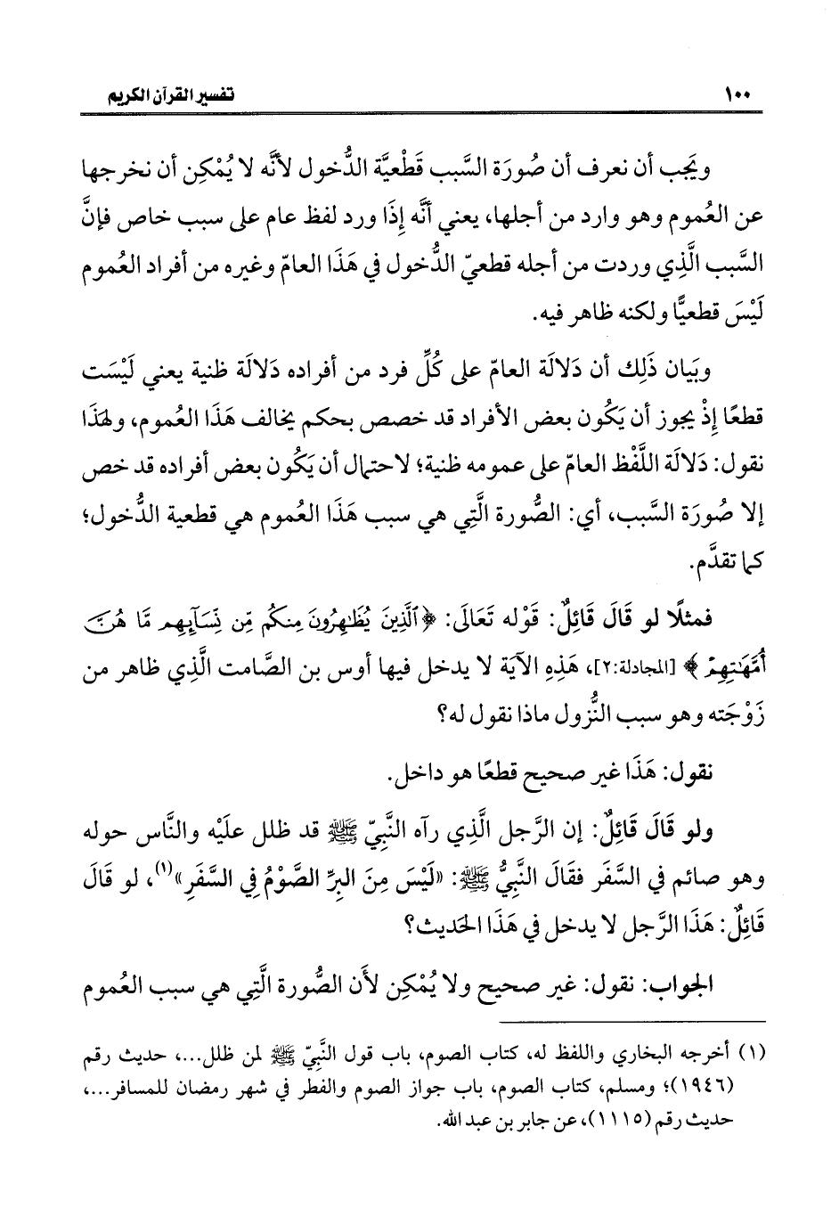فمثلًا لو قَالَ قَائِل: قَوْله تَعَالَى: {الَّذِينَ يُظَاهِرُونَ مِنْكُمْ مِنْ نِسَائِهِمْ مَا هُنَّ أُمَّهَاتِهِمْ} [المجادلة: ٢]، هَذِهِ الآية لا يدخل فيها أوس بن الصَّامت الَّذِي ظاهر من زَوْجَته وهو سبب النُّزول ماذا نقول له؟