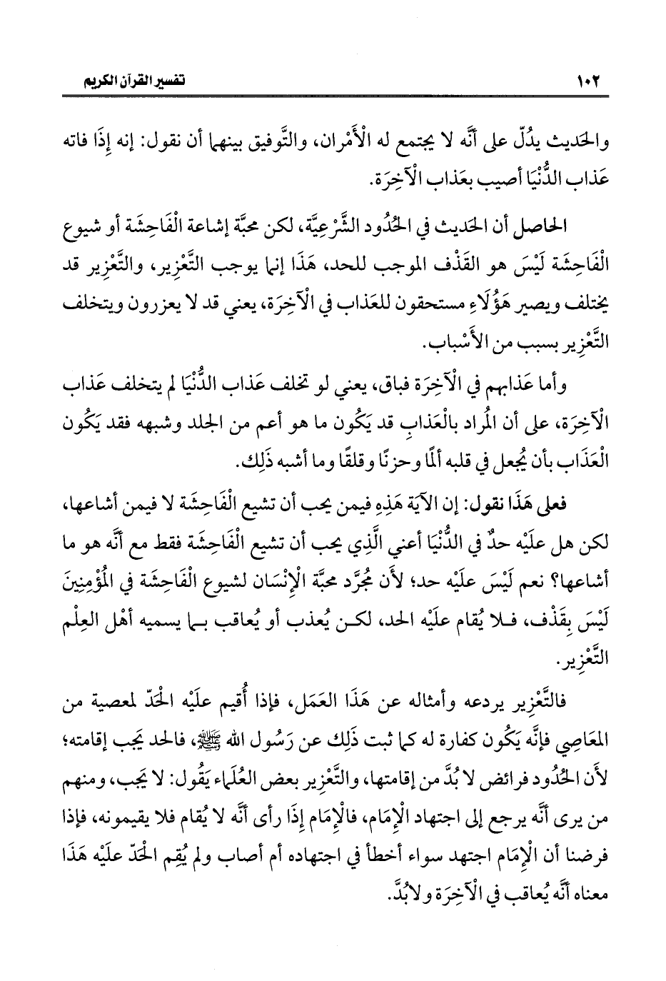 الحاصل أن الحَديث في الحُدُود الشَّرْعِيَّة، لكن محبَّة إشاعة الْفَاحِشَة أو شيوع الْفَاحِشَة لَيْسَ هو القَذْف الموجب للحد، هَذَا إنما يوجب التَّعْزِير، والتَّعْزِير قد يختلف ويصير هَؤُلَاءِ مستحقون للعَذاب في الْآخِرَة، يعني قد لا يعزرون ويتخلف التَّعْزِير بسبب من الأَسْباب.