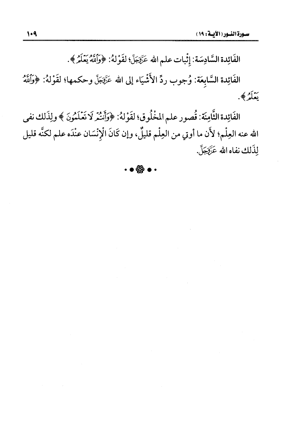 الفَائِدة الثَّامِنة: قُصور علم المخْلُوق؛ لقَوْلهُ: {وَأَنْتُمْ لَا تَعْلَمُونَ} ولذَلك نفى الله عنه العِلْم؛ لأَن ما أوتي من العِلْم قليلٌ، وإن كَانَ الْإِنْسَان عنْدَه علم لكنَّه قليل لِذَلك نفاه الله عَزَّ وجلَّ.