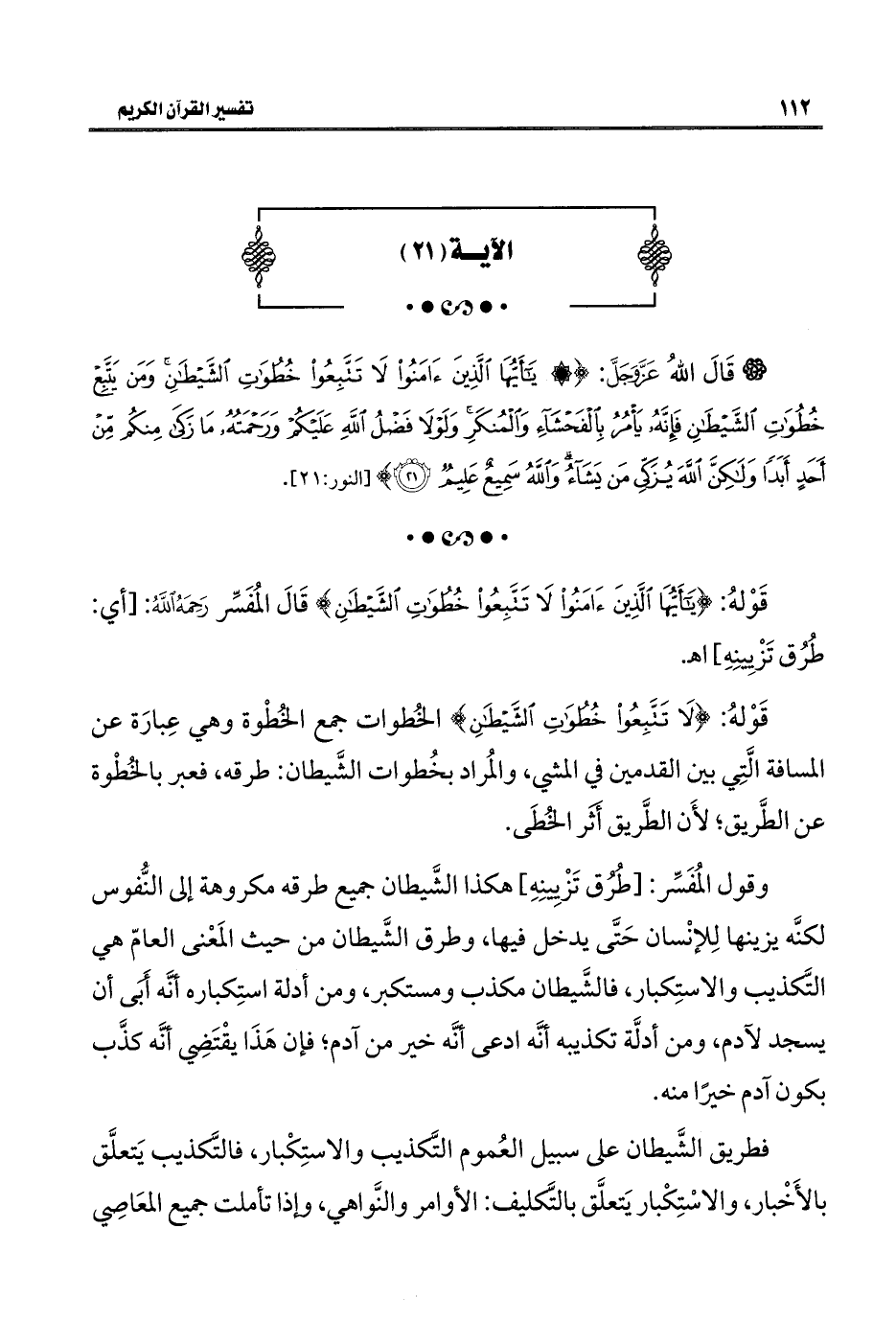 قَوْلهُ: {يَاأَيُّهَا الَّذِينَ آمَنُوا لَا تَتَّبِعُوا خُطُوَاتِ الشَّيْطَانِ} قَالَ المُفَسِّر رَحَمَهُ اللَّهُ: [أي: طُرُق تَزْيِينِهِ] اهـ.