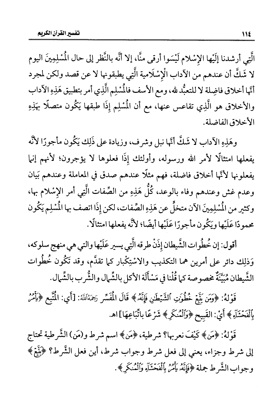 قَوْلهُ: {وَمَنْ يَتَّبِعْ خُطُوَاتِ الشَّيْطَانِ فَإِنَّهُ} قَالَ المُفَسِّر رَحَمَهُ اللهُ: [أَي: المتبع {يَأْمُرُ بِالْفَحْشَاءِ} أَي: القَبِيح {وَالْمُنْكَرِ} شَرْعًا باتِّباعِهَا] اهـ.