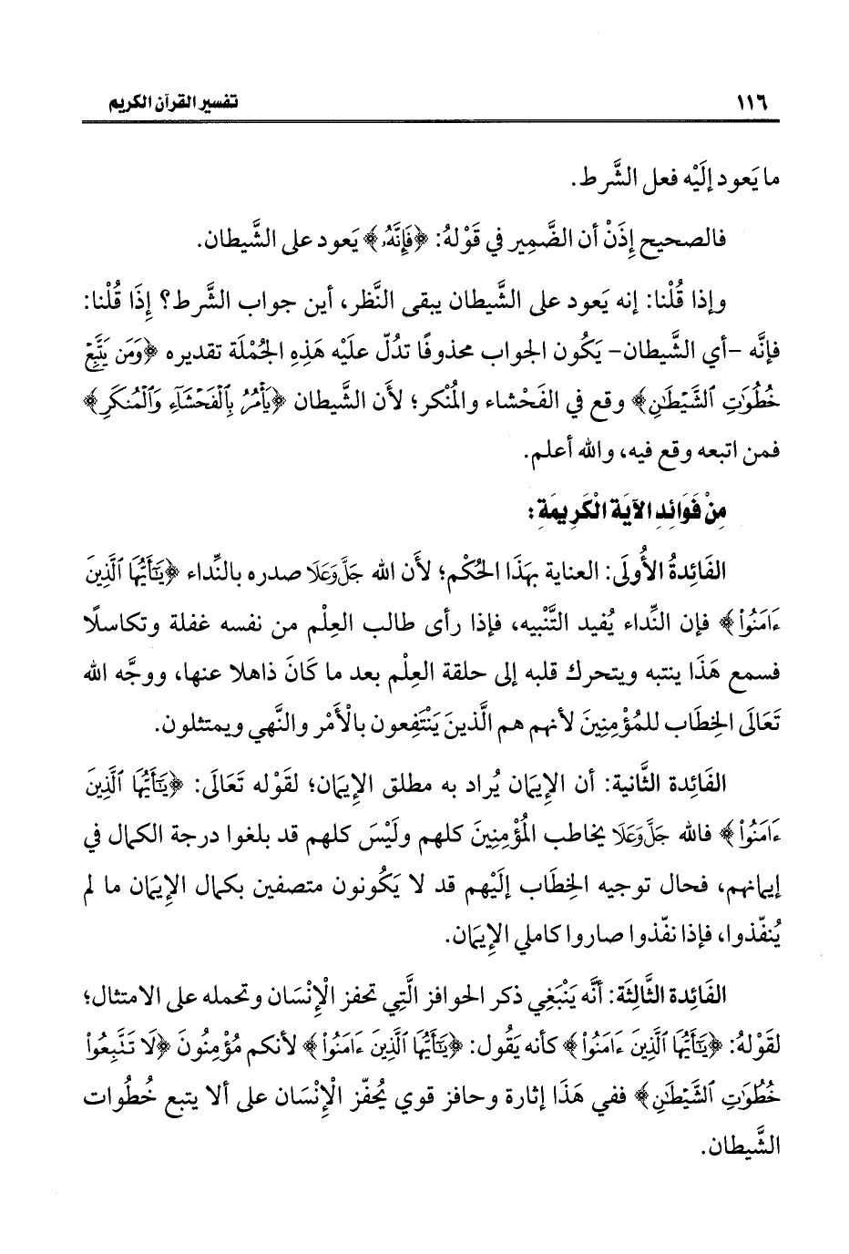 الفَائِدة الثَّالِثَة: أنَّه يَنْبَغِي ذكر الحوافز الَّتِي تحفز الْإِنْسَان وتحمله على الامتثال؛ لقَوْلهُ: {يَاأَيُّهَا الَّذِينَ آمَنُوا} كأنه يَقُول: {يَاأَيُّهَا الَّذِينَ آمَنُوا} لأنكم مُؤْمِنُونَ {لَا تَتَّبِعُوا خُطُوَاتِ الشَّيْطَانِ} ففي هَذَا إثارة وحافز قوي يُحفّز الْإِنْسَان على ألا يتبع خُطُوات الشَّيطان.