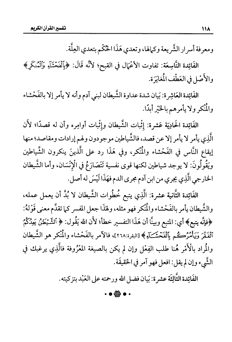 الفَائِدة الثَّانية عشرة: الَّذِي يتبع خُطُوات الشَّيطان لا بُدَّ أن يعمل عمله، والشَّيطان يأمر بالفَحْشاء والمُنْكر فهو مثله، ولهذَا جعل المفسر كما تقدَّم معنى قَوْلهُ: {فَإِنَّهُ يَتَّبِعْ} أي: المتبع وبينَّا أن هَذَا التفسير خطأ؛ لأَن الله يَقُول: {الشَّيْطَانُ يَعِدُكُمُ الْفَقْرَ وَيَأْمُرُكُمْ بِالْفَحْشَاءِ} [البقرة: ٢٦٨]، فالآمر بالفَحْشاء والمُنْكر هو الشَّيطان والمُراد بالْأَمْر هُنا طلب الفِعْل وإن لم يكن بالصيغة المعْرُوفة فالَّذِي يرغبك في الشَّيء وإن لم يقل: افعل فهو آمر في الحقيقَة.