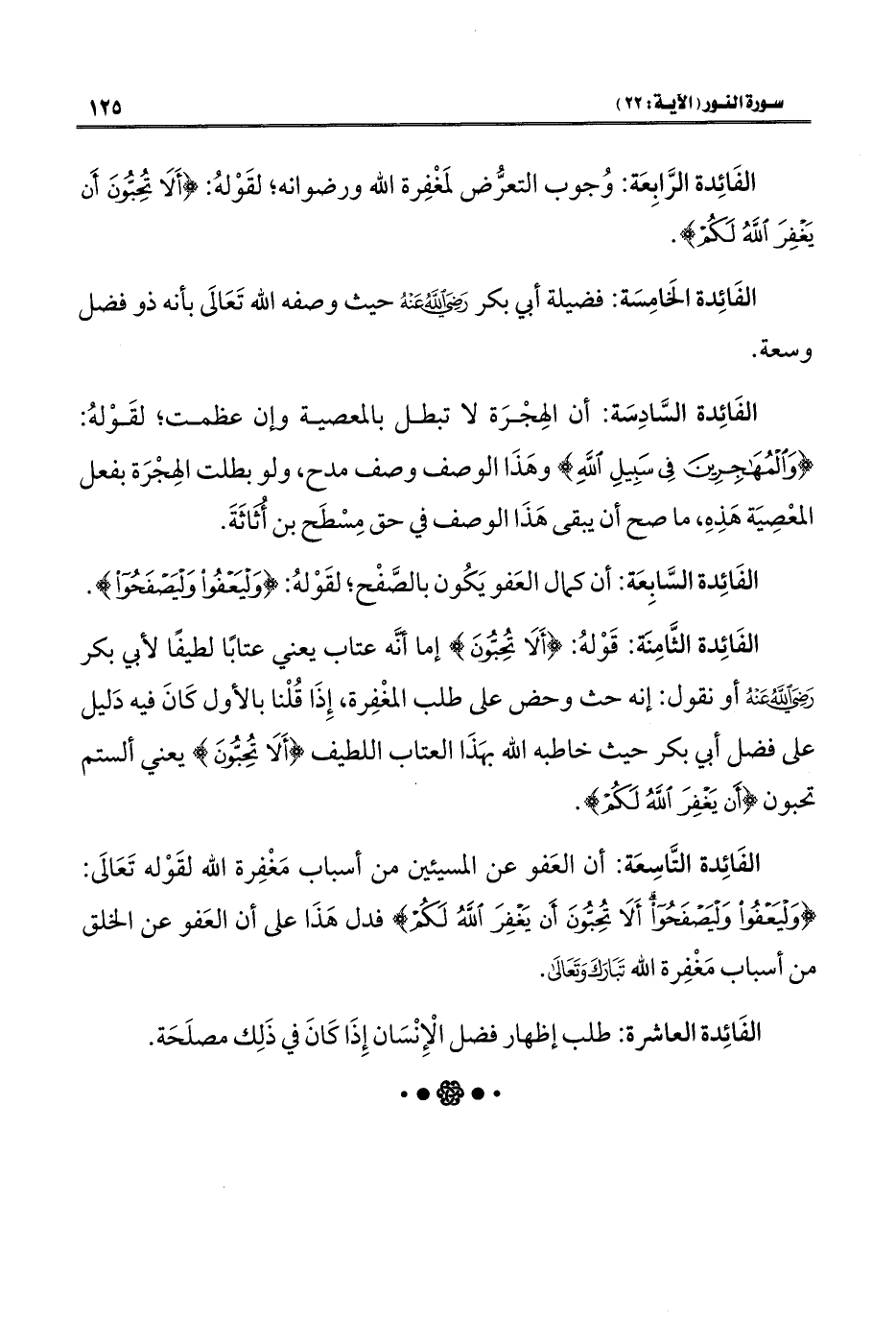 الفَائِدة التَّاسِعَة: أن العَفو عن المسيئين من أسباب مَغْفِرة الله لقَوْله تَعَالَى: {وَلْيَصْفَحُوا أَلَا تُحِبُّونَ أَنْ يَغْفِرَ اللَّهُ لَكُمْ} فدل هَذَا على أن العَفو عن الخلق من أسباب مَغْفِرة الله تبارَكَ وَتَعَالَى.