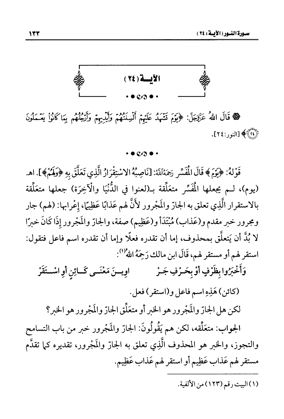 (يوم)، لم يجعلها المُفَسِّر متعَلِّقة بـ (لعنوا في الدُّنْيَا والآخِرَة) جعلها متعَلِّقة بالاستقرار الَّذِي تعلق به الجارّ والمَجْرور لأَنَّ لهم عَذابًا عَظِيمًا، إِعْرابها: (لهم) جار ومجرور خبر مقدم و (عَذاب) مُبْتَدَأ و (عَظِيم) صفة، والجارّ والمَجْرور إِذَا كَانَ خبرًا لا بُدَّ أن يَتعلَّق بمحذوف، إما أن تقدره فعلًا وإما أن تقدره اسم فاعل فتقول: استقر لهم أو مستقر لهم، قَالَ ابن مالك رَحِمَهُ الله (¬١):