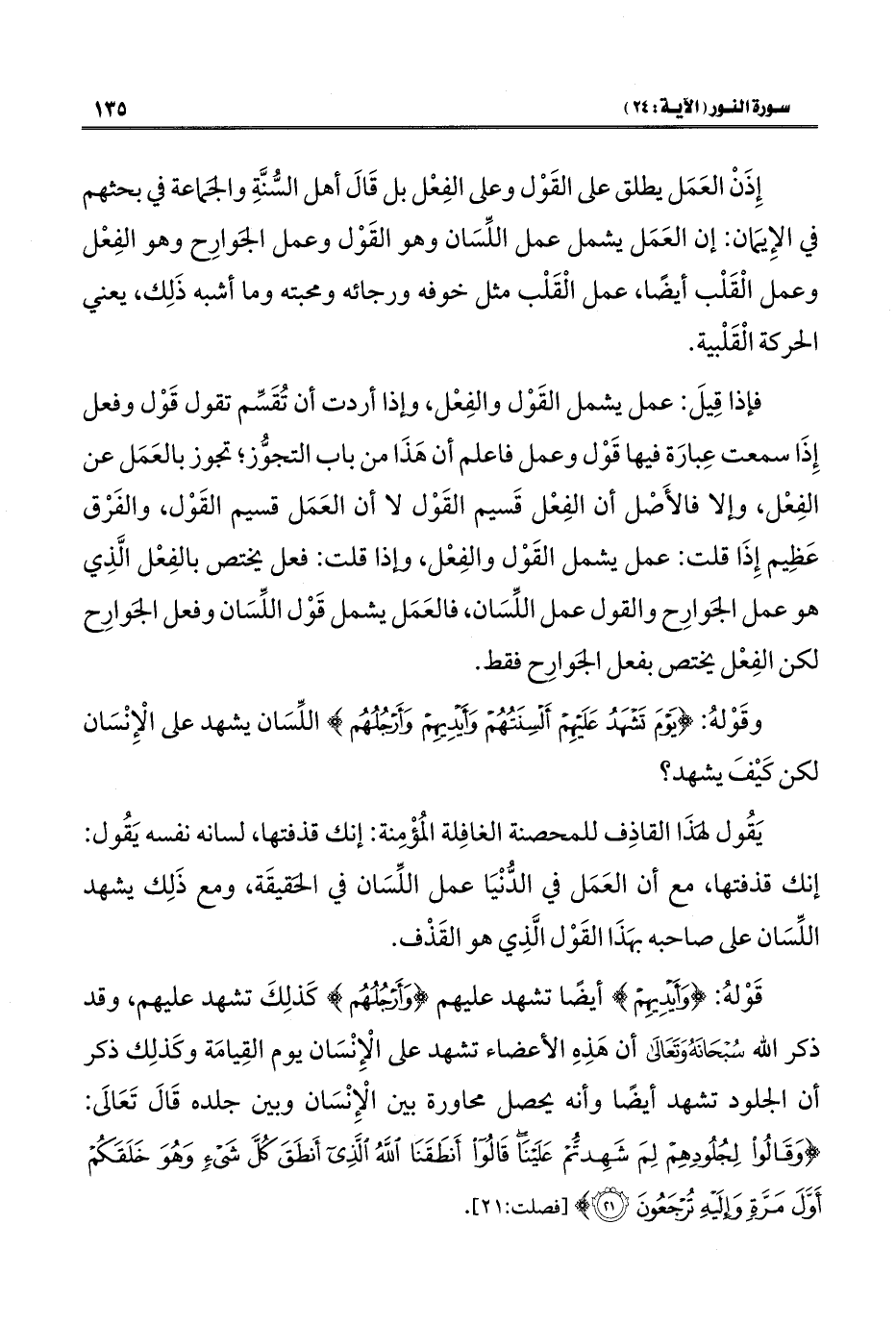 وقَوْلهُ: {يَوْمَ تَشْهَدُ عَلَيْهِمْ أَلْسِنَتُهُمْ وَأَيْدِيهِمْ وَأَرْجُلُهُمْ} اللِّسَان يشهد على الْإِنْسَان لكن كَيْفَ يشهد؟