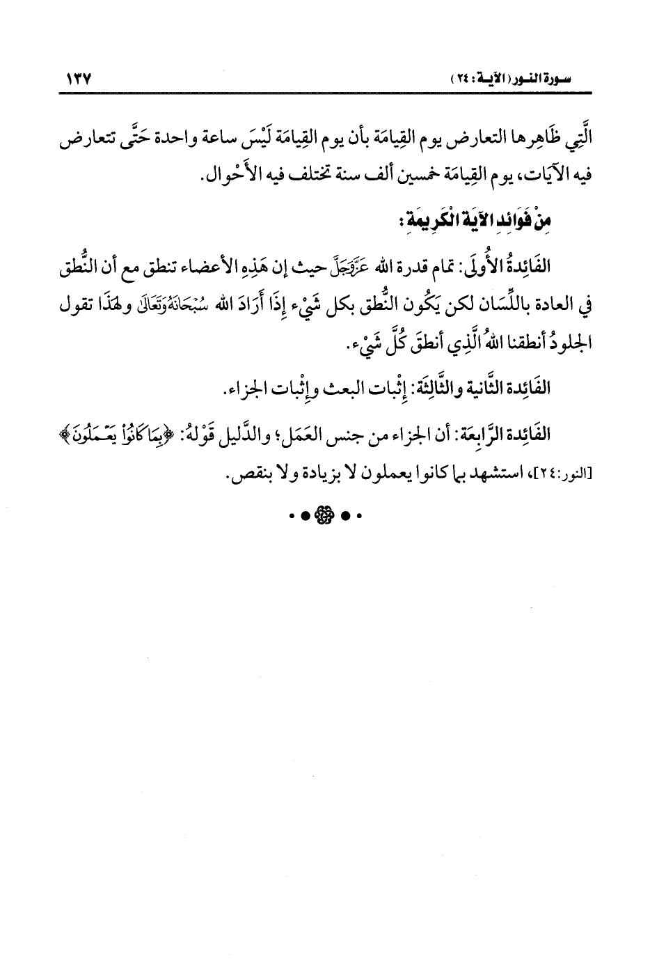 الفَائِدة الرَّابِعَة: أن الجزاء من جنس العَمَل؛ والدَّليل قَوْلهُ: {بِمَا كَانُوا يَعْمَلُونَ} [النور: ٢٤]، استشهد بما كانوا يعملون لا بزيادة ولا بنقص.