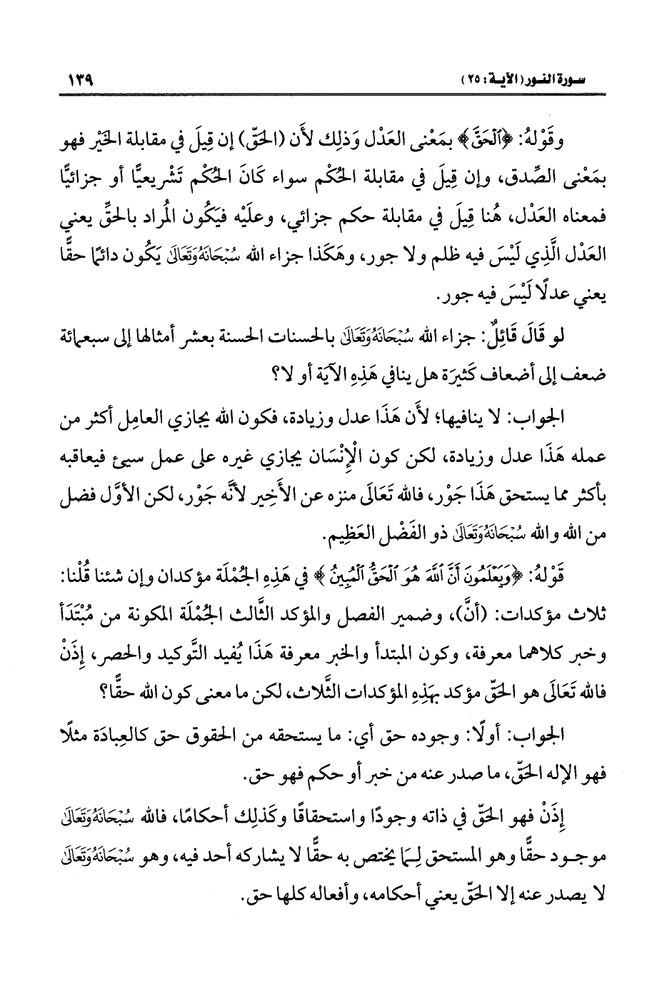 قَوْلهُ: {وَيَعْلَمُونَ أَنَّ اللَّهَ هُوَ الْحَقُّ الْمُبِينُ} في هَذه الجُمْلَة مؤكدان وإن شئنا قُلْنا: ثلاث مؤكدات: (أنَّ)، وضمير الفصل والمؤكد الثَّالث الجُمْلَة المكونة من مُبْتَدَأ وخبر كلاهما معرفة، وكون المبتدأ والخبر معرفة هَذَا يُفيد التَّوكيد والحصر، إِذَنْ فالله تَعَالَى هو الحق مؤكد بهَذه المؤكدات الثَّلاث، لكن ما معنى كون الله حقًّا؟