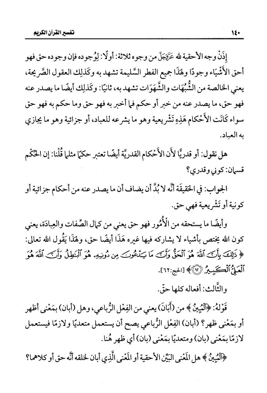 إِذَنْ وجه الأحقية لله عَزَّ وجَلَّ من وجوه ثلاثة: أولًا: لِوُجوده فإن وجوده حق فهو أحق الأَشْيَاء وجودًا ولهذَا جميع الفطر السَّليمة تشهد به وكَذلِك العقول الصريحة، يعني الخالصة من الشُّبُهَات والشَّهَوَات تشهد به، ثانيًا: وكَذلِك أيضا ما يصدر عنه فهو حق، ما يصدر عنه من خبر أوحكم فما أخبر به فهو حق وما حكم به فهو حق سواء كَانَت الأَحْكام هَذه تَشْريعية وهو ما يشرعه للعباد، أو جزائية وهو ما يجازي به العباد.