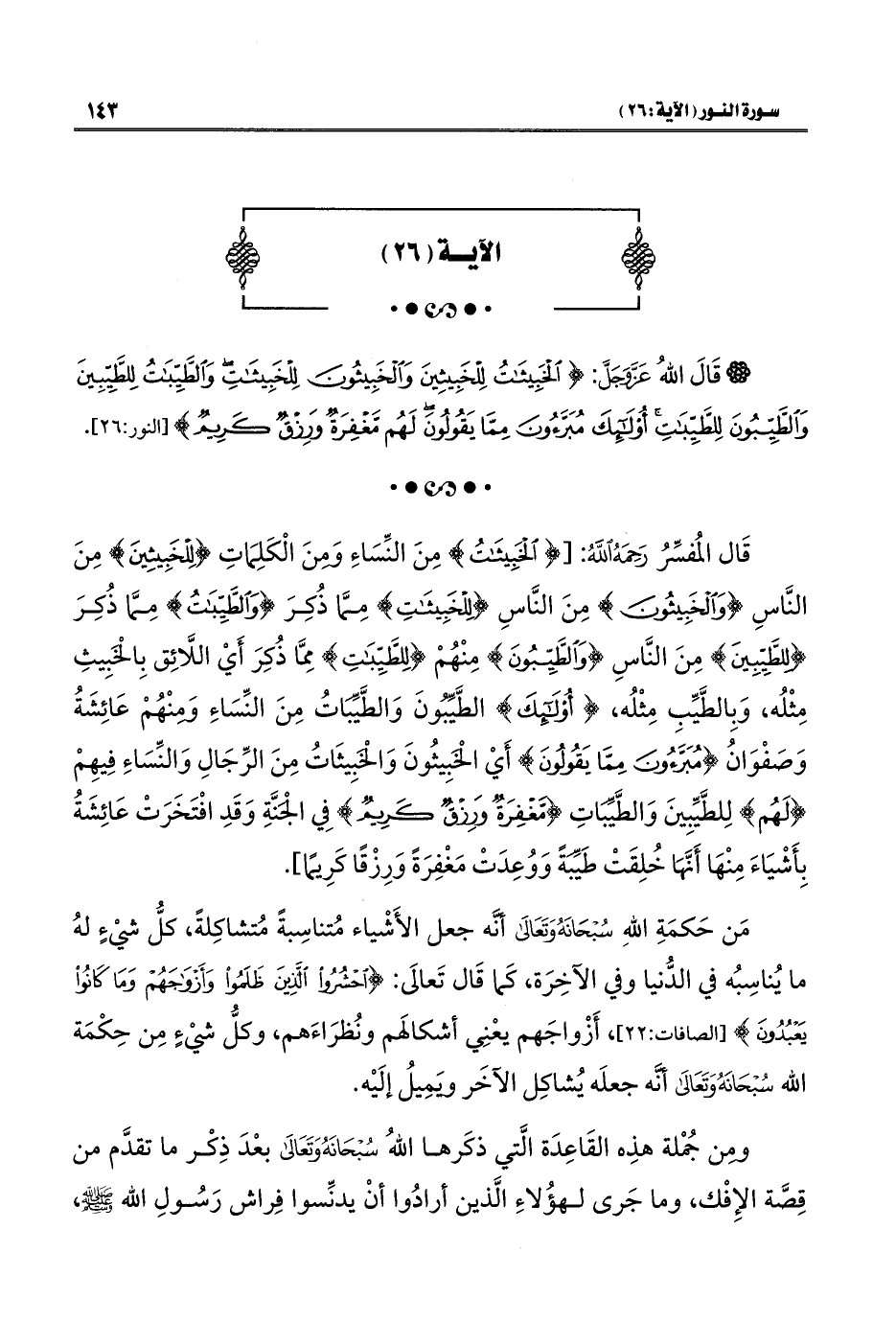 قَال المُفسِّرُ رَحَمَهُ اللَّهُ: [{الْخَبِيثَاتُ} مِنَ النِّسَاءِ وَمنَ الْكَلِمَاتِ {لِلْخَبِيثِينَ} {لِلْخَبِيثِينَ} مِنَ النَّاسِ {وَالْخَبِيثُونَ} مِنَ النَّاسِ {لِلْخَبِيثَاتِ} مِمَّا ذُكِرَ {وَالطَّيِّبَاتُ} مِمَّا ذُكرَ {لِلطَّيِّبِينَ} مِنَ النَّاسِ {وَالطَّيِّبُونَ} مِنْهُمْ {لِلطَّيِّبَاتِ} مِمَّا ذُكِرَ أَي اللَّائِق بِالْجبِيثِ مِثْلُه، وَبِالطَّيِّبِ مِثْلُه، {أُولَئِكَ} الطَّيبونَ وَالطَّيَباتُ مِنَ النِّسَاءِ وَمنْهُمْ عَائِشَةُ وَصَفْوَانُ {مُبَرَّءُونَ مِمَّا يَقُولُونَ} أَي الْخبِيثُونَ وَالْخبِيثَاتُ مِنَ الرِّجَالِ وَالنِّسَاءِ فِيهِمْ {لَهُمْ} لِلطَّيِّبِينَ وَالطَّيَباتُ {لَهُمْ مَغْفِرَةٌ وَرِزْقٌ كَرِيمٌ} فِي الجْنَّةِ وَقَدِ افْتَخَرَتْ عَائِشَةُ بِأَشْيَاءَ مِنْهَا أَنَّهَا خُلِقَتْ طَيِّبةً وَوُعِدَتْ مَغْفِرَةً وَرِزْقًا كَرِيمًا].