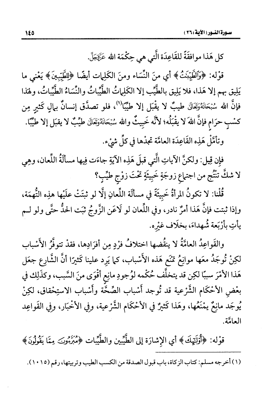 قوْله: {وَالطَّيِّبَاتُ} أي منَ النِّسَاء ومنَ الكَلِمات أيضًا {لِلطَّيِّبِينَ} يَعْني ما يَلِيق بهم إلا هَذا، فلا يَلِيق بالطَّيّب إلا الكَلِماتُ الطَّيِّباتُ والنِّسَاءُ الطَّيِّباتُ، ولهذا فإنَّ الله سُبحَانَهُ وَتَعالى طيبٌ لا يقْبَل إلا طيبًا (¬١)، فلو تصدَّق إنسانٌ بمالٍ كَثير مِن كسْبٍ حرَامٍ فإنَّ اللهَ لا يقْبَلُه؛ لأنَّه خَبِيثٌ والله سُبحَانَهُ وَتَعَالَى طيِّبٌ لا يقبَل إلا طيبًا.