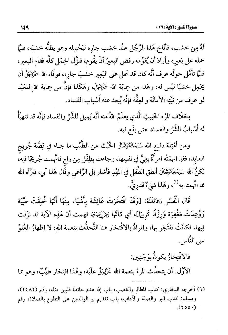 لهُ مِن خشب، فأناخ هَذا الرَّجُل عنْد خشب جارِه ليَحْمِله وهو يظنُّه خشبَه، فلمَّا حمله على بَعيرِه وأرادَ أن يُقوِّمه رفض البعيرُ أنْ يقُوم، فنزَّل الحِمْل كلَّه فقام البعير، فلمَّا تأمَّل حولَه عرف أنَّه كان قد حَمل على البَعِير خشبَ جارِه، فوقَاه الله عزَّ وجلَّ أن يحْمِل خشبًا ليْس له، وهَذا من حِمايَة الله عزَّ وجلَّ، وهَكَذا فإنَّ من حِماية اللهِ للعَبْد لو عرف من نيَّته الأمانَة والعِفَّة فإنَّه يُبعد عنه أَسْباب الفساد.