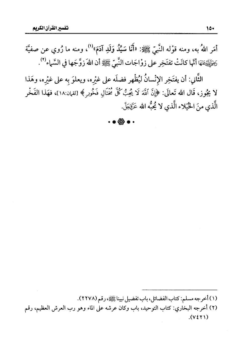 الثَّاني: أن يفتَخِر الإِنْسانُ ليُظْهر فضلَه على غيْرِه، ويعلوَ بِه على غيْرِه، وهَذا لا يجُوز، قَال الله تَعالَى: {إِنَّ اللَّهَ لَا يُحِبُّ كُلَّ مُخْتَالٍ فَخُورٍ (١٨)} [لقمان: ١٨]، فهَذا الفَخْر الَّذي منَ الخُيَلاء الَّذي لا يُحبُّه الله عَزَّ وجَلَّ.