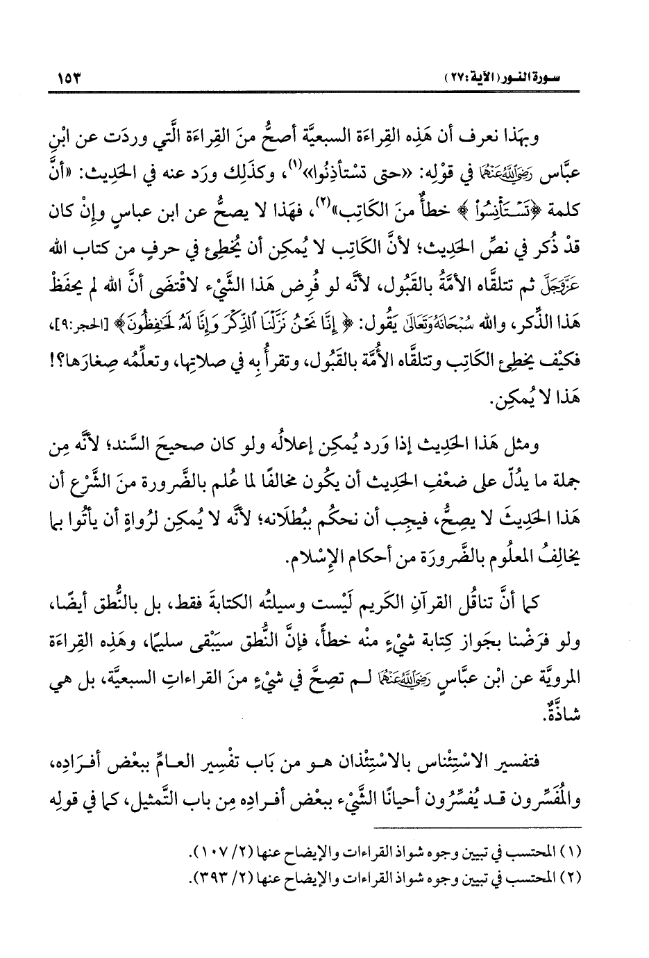 وبهَذا نعرف أن هَذِه القِراءَة السبعيَّة أصحُّ منَ القِراءَة الَّتي وردَت عن ابْنِ عبَّاس - رضي الله عنها - في قوْلِه: "حتى تسْتأذِنُوا" (¬١)، وكذَلِك ورَد عنه في الحدِيث: "أنَّ كلمة {تَسْتَأْنِسُوا} خطأٌ منَ الكَاتِب" (¬٢)، فهَذا لا يصحُّ عن ابن عباسٍ وإِنْ كان قدْ ذُكر في نصِّ الحدِيث؛ لأنَّ الكَاتِب لا يُمكِن أن يُخطِئ في حرفٍ من كتاب الله عَزَّ وَجَلَّ ثم تتلقَّاه الأمَّةُ بالقَبُول، لأنَّه لو فُرِض هَذا الشَّيْء لاقْتضَى أنَّ الله لم يحفَظْ هَذا الذِّكر، والله سُبْحَانَهُ وَتَعَالى يَقُول: {إِنَّا نَحْنُ نَزَّلْنَا الذِّكْرَ وَإِنَّا لَهُ لَحَافِظُونَ} [الحجر: ٩]، فكيْف يخطِئ الكَاتِب وتتلقَّاه الأُمَّة بالقَبُول، وتقرأُ بِه في صلاتِها، وتعلِّمُه صِغارَها؟ ! هَذا لا يُمكِن.