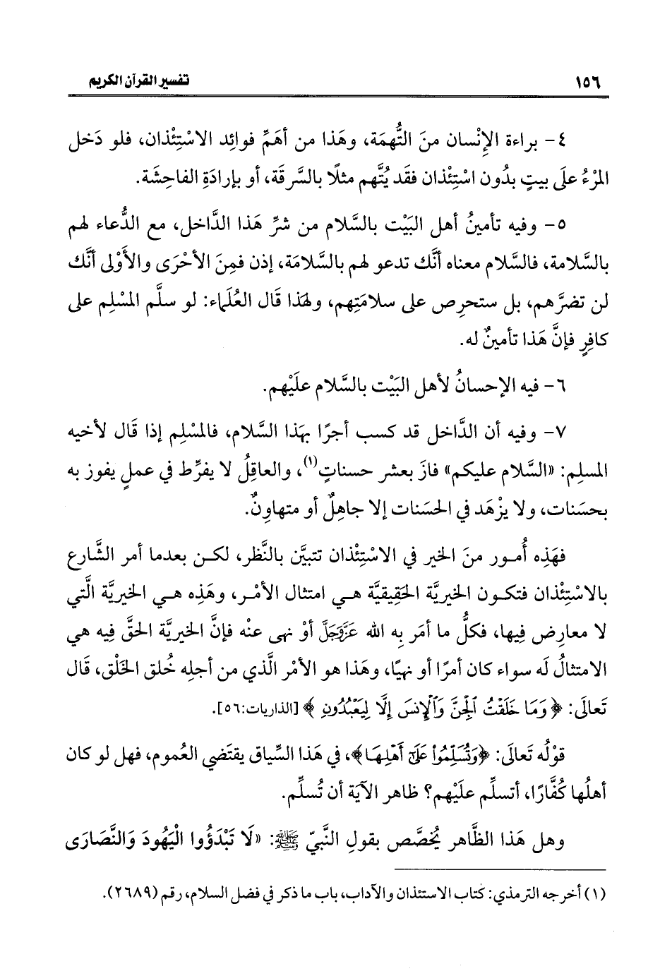 قوْلُه تَعالَى: {وَتُسَلِّمُوا عَلَى أَهْلِهَا}، في هَذا السِّياق يقتَضي العُموم، فهل لو كان أهلُها كُفَّارًا، أتسلِّم علَيْهم؟ ظاهر الآيَة أن تُسلِّم.