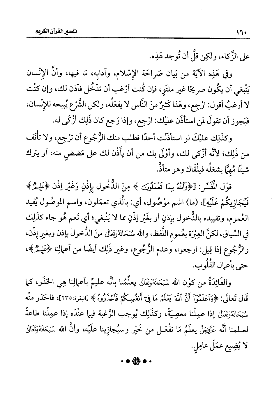 قوْل المُفَسِّر: [{وَاللَّهُ بِمَا تَعْمَلُونَ} مِنَ الدُّخُول بِإِذْنٍ وَغَيْر إذْن {عَلِيمٌ} فَيُجَازِيكُمْ عَلَيْهِ]، (ما) اسْم موْصُول، أي: بالَّذي تعمَلون، واسم الموصُول يُفيد العُموم، وتقييده بالدُّخول بإِذنٍ أو بغَيْر إذْنٍ مما لا يَنْبغي؛ أي نَعم هُو جاء كذَلِك في السِّياق، لكنَّ العِبْرَة بعُمومِ اللَّفظ، والله سُبْحَانَهُ وَتَعَالَى منَ الدُّخول بإذن وبغيرِ إِذْن، والرُّجُوع إذا قِيل: ارجعوا، وعدم الرُّجُوع، وغير ذَلِك أيضًا من أعمالِنا {عَلِيمٌ}، حتى بأعمال القُلُوب.