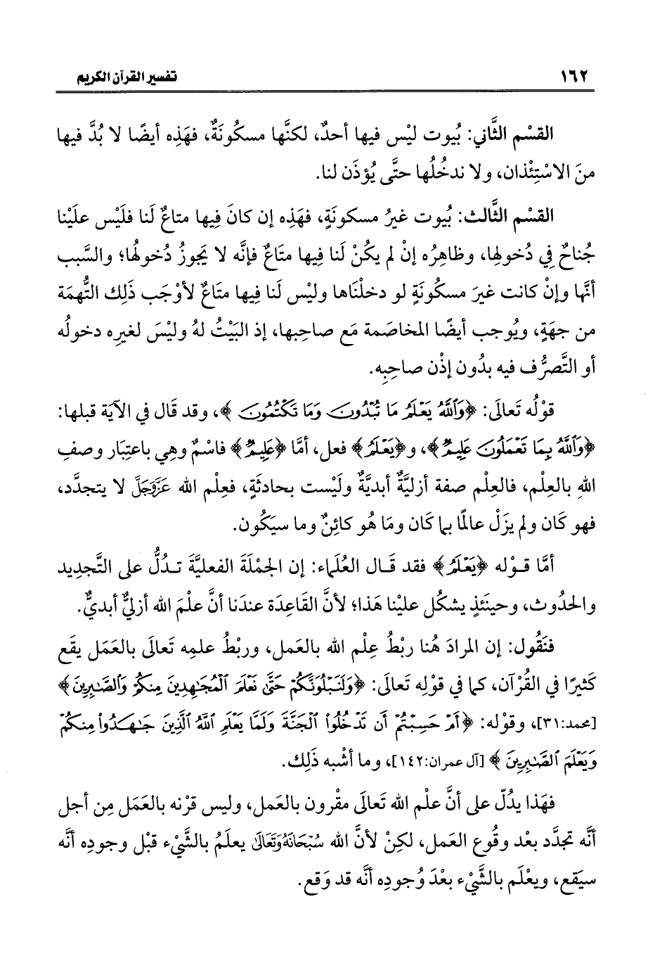 فهَذا يدُلّ على أنَّ علْم الله تَعالَى مقْرون بالعَمل، وليس قرْنه بالعَمَل مِن أجل أنَّه تجدَّد بعْد وقُوع العَمل، لكِنْ لأنَّ الله سُبْحَانَهُ وَتَعَالَى يعلَمُ بالشَّيْء قبْل وجودِه أنَّه سيَقع، ويعْلَم بالشَّيْء بعْدَ وُجودِه أنَّه قد وَقع.