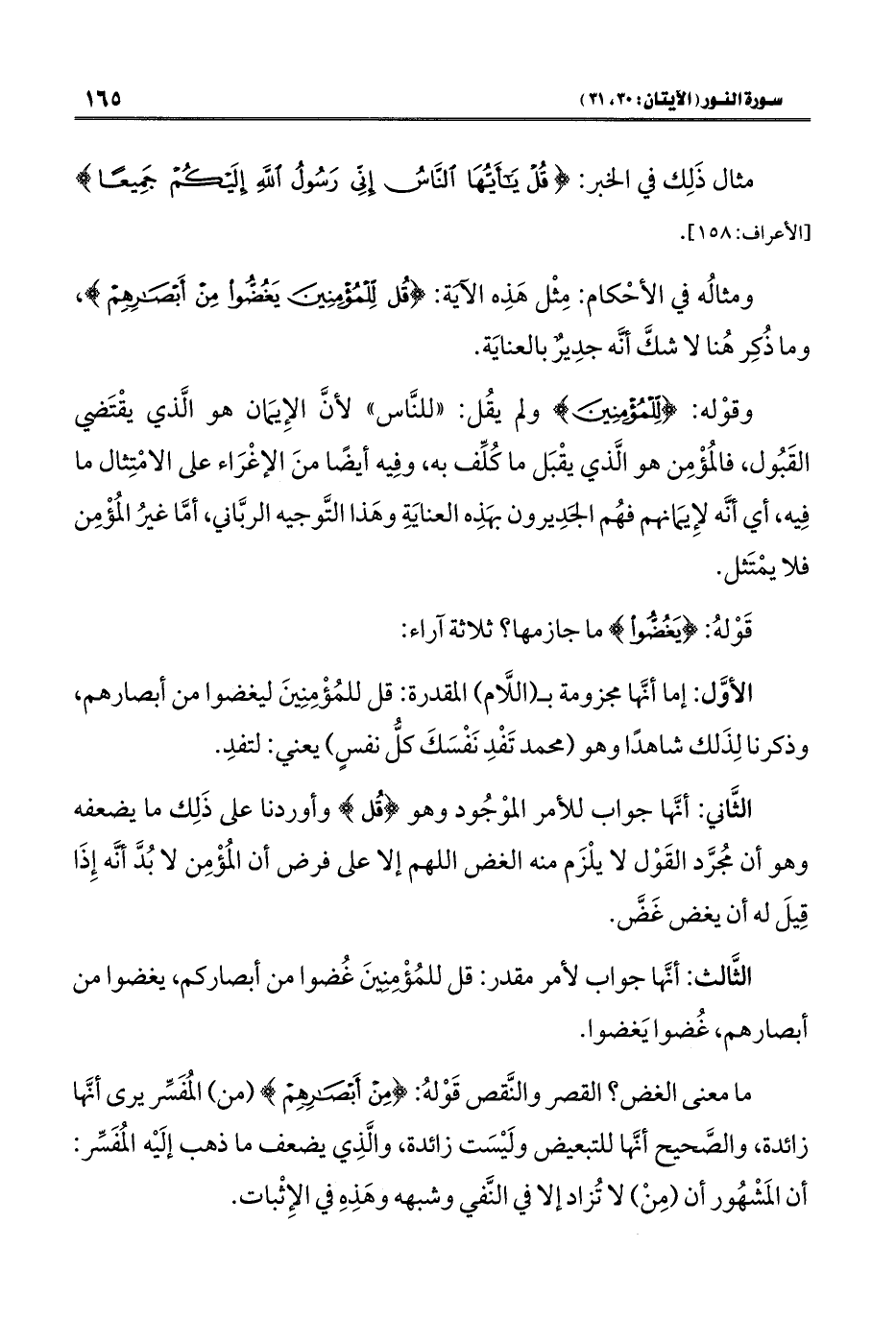 ما معنى الغض؟ القصر والنَّقص قَوْلهُ: {مِنْ أَبْصَارِهِمْ} (من) المُفَسِّر يرى أنَّها زائدة، والصَّحيح أنَّها للتبعيض ولَيْسَت زائدة، والَّذِي يضعف ما ذهب إلَيْه المُفَسِّر: أن المَشْهُور أن (مِنْ) لا تُزاد إلا في النَّفي وشبهه وهَذه في الإِثْبات.