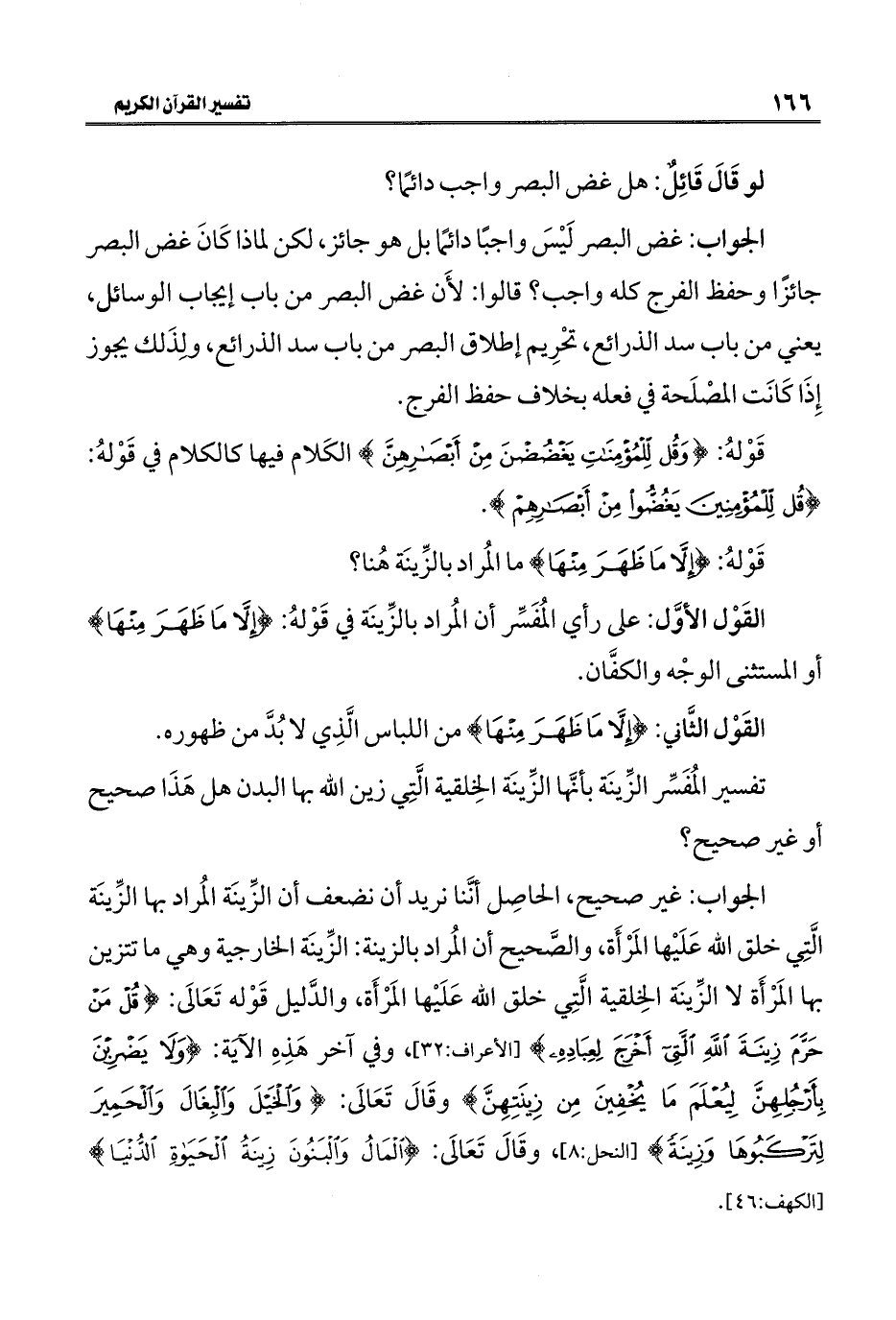 الجواب: غير صحيح، الحاصِل أنَّنا نريد أن نضعف أن الزِّيَنَة المُراد بها الزِّينَة الَّتِي خلق الله عَلَيْها المَرْأَة، والصَّحيح أن المُراد بالزينة: الزِّينَة الخارجية وهي ما تتزين بها المَرْأَة لا الزِّينَة الخِلقية الَّتِي خلق الله عَلَيْها المَرْأَة، والدَّليل قَوْله تَعَالَى: {قُلْ مَنْ حَرَّمَ زِينَةَ اللَّهِ الَّتِي أَخْرَجَ لِعِبَادِهِ} [الأعراف: ٣٢]، وفي آخر هَذه الآيَة: {وَلَا يَضْرِبْنَ بِأَرْجُلِهِنَّ لِيُعْلَمَ مَا يُخْفِينَ مِنْ زِينَتِهِنَّ} وقَالَ تَعَالَى: {وَالْخَيْلَ وَالْبِغَالَ وَالْحَمِيرَ لِتَرْكَبُوهَا وَزِينَةً} [النحل: ٨]، وقَالَ تَعَالَى: {الْمَالُ وَالْبَنُونَ زِينَةُ الْحَيَاةِ الدُّنْيَا} [الكهف: ٤٦].