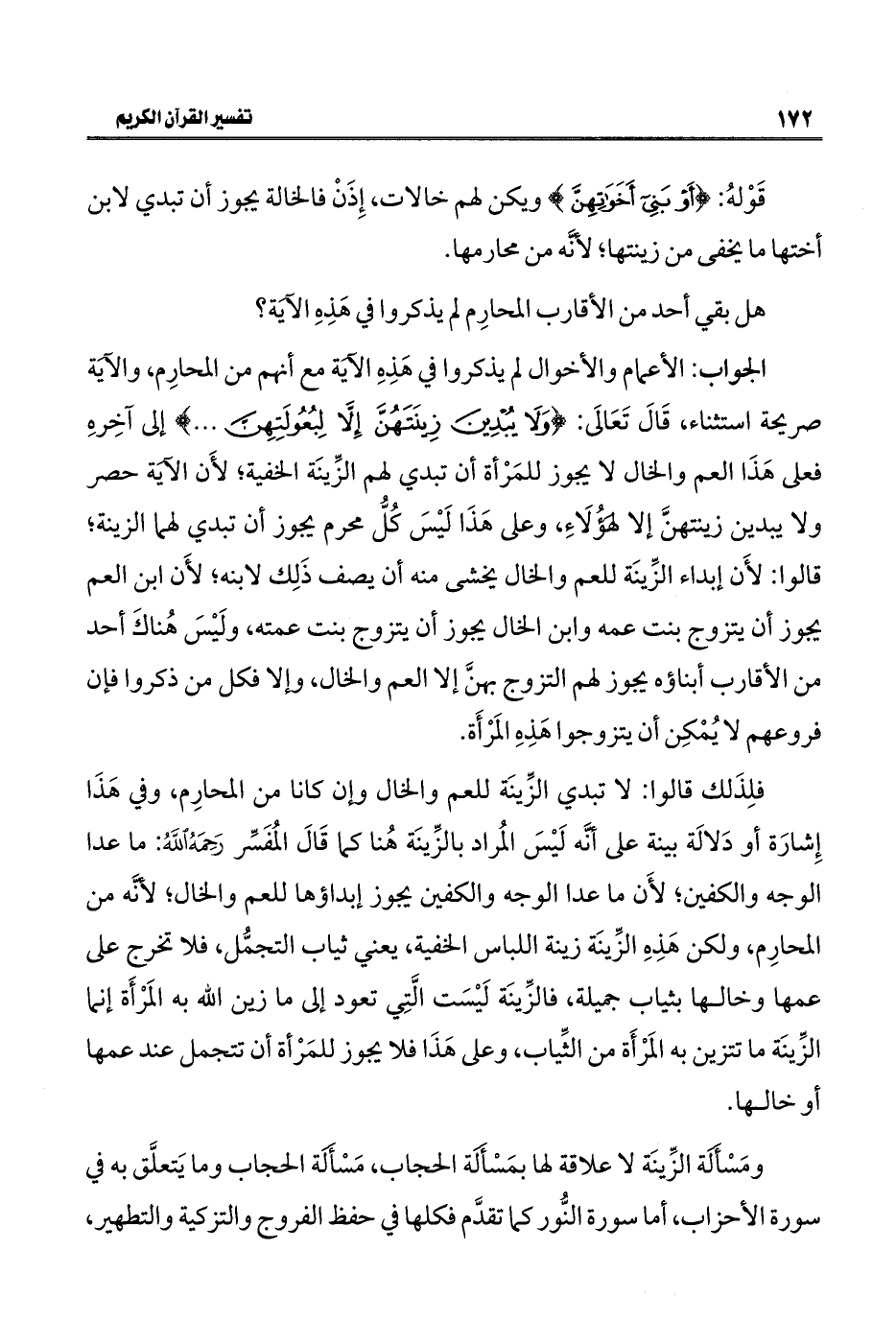 فلِذَلك قالوا: لا تبدي الزِّينَة للعم والخال وإن كانا من المحارِم، وفي هَذَا إِشارَة أو دَلالَة بينة على أنَّه لَيْسَ المُراد بالزِّينَة هُنا كما قَالَ المُفَسِّر رَحَمَهُ اللهُ: ما عدا الوجه والكفين، لأَن ما عدا الوجه والكفين يجوز إبداؤها للعم والخال؛ لأنه من المحارِم، ولكن هَذه الزِّينَة زينة اللباس الخفية، يعني ثياب التجمُّل، فلا تخرج على عمها وخالها بثياب جميلة، فالزِّينَة لَيْسَت الَّتِي تعود إلى ما زين الله به المَرْأَة إنما الزِّينَة ما تتزين به المَرْأَة من الثِّياب، وعلى هَذَا فلا يجوز للمَرْأة أن تتجمل عند عمها أو خالها.