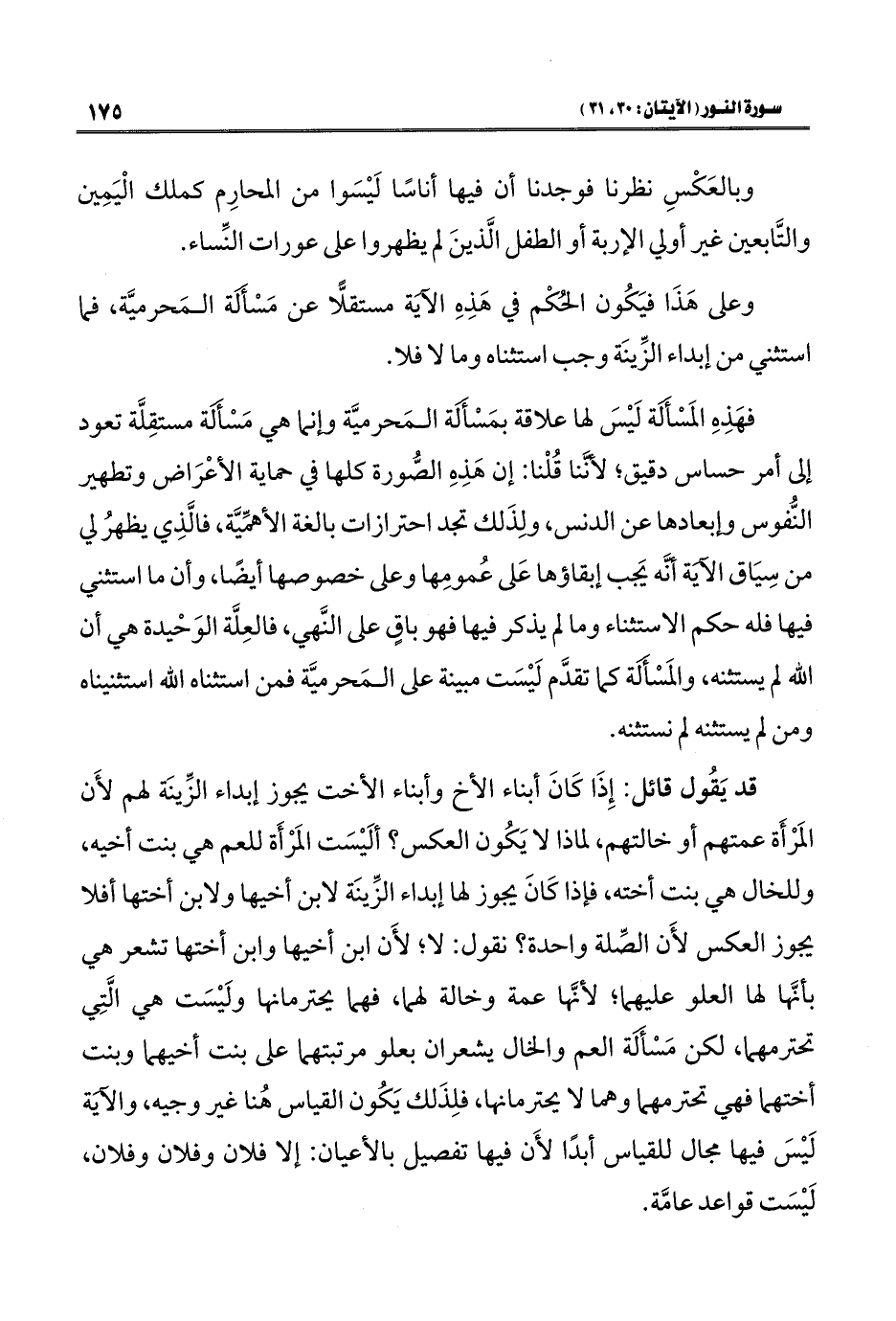 قد يَقُول قائل: إِذَا كَانَ أبناء الأخ وأبناء الأخت يجوز إبداء الزِّينَة لهم لأَن المَرْأَة عمتهم أو خالتهم، لماذا لا يَكُون العكس؟ ألَيْسَت المَرْأَة للعم هي بنت أخيه، وللخال هي بنت أخته، فإذا كَانَ يجوز لها إبداء الزِّينَة لابن أخيها ولابن أختها أفلا يجوز العكس لأَن الصِّلة واحدة؟ نقول: لا، لأَن ابن أخيها وابن أختها تشعر هي بأنَّها لها العلو عليهما؛ لأنَّها عمة وخالة لهما، فهما يحترمانها ولَيْسَت هي الَّتِي تحترمهما، لكن مَسْأَلة العم والخال يشعران بعلو مرتبتهما على بنت أخيهما وبنت أختهما فهي تحترمهما وهما لا يحترمانها، فلِذَلك يَكُون القياس هُنا غير وجيه، والآيَة لَيْسَ فيها مجال للقياس أبدًا لأَن فيها تفصيل بالأعيان: إلا فلان وفلان وفلان، لَيْسَت قواعد عامَّة.