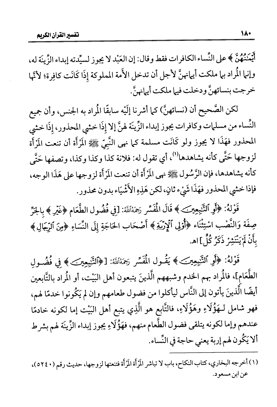 قَوْلهُ: {أَوِ التَّابِعِينَ} يَقُول المُفَسِّر رَحَمَهُ اللهُ: [{التَّابِعِينَ} فِي فُضُولِ الطَّعَام]، فالمُراد بهم الخدم وشبههم الَّذينَ يتبعون أهل البَيْت، أو المُراد بالتَّابعين أيضًا الَّذينَ يأتون إلى النَّاس ليأكلوا من فضول طعامهم وإن لم يَكُونوا خدمًا لهم، فهو شامل لهَؤُلَاءِ وهَؤُلَاءِ، فالتَّابع هو الَّذِي يتبع أهل البَيْت إما لكونه خادمًا عندهم وإما لكونه يتلقى فضول الطَّعام منهم، فهَؤُلَاءِ يجوز إبداء الزِّينَة لهم بشرط ألا يَكُون لهم إربة يعني حاجة في النِّساء.