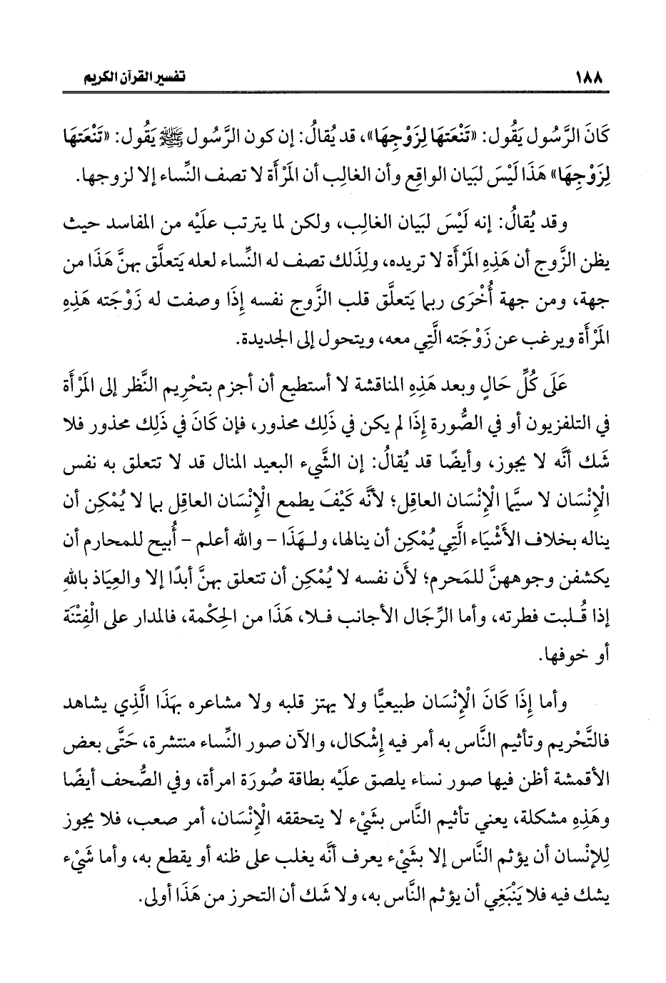 عَلَى كُلِّ حَالٍ وبعد هَذِهِ المناقشة لا أستطيع أن أجزم بتحْرِيم النَّظر إلى المَرْأَة في التلفزيون أو في الصُّورة إِذَا لم يكن في ذَلِك محذور، فإن كَانَ في ذَلِك محذور فلا شَك أنَّه لا يجوز، وأيضًا قد يُقالُ: إن الشَّيء البعيد المنال قد لا تتعلق به نفس الْإِنْسَان لا سيَّما الْإِنْسَان العاقِل؛ لأنَّه كَيْفَ يطمع الْإِنْسَان العاقِل بما لا يُمْكِن أن يناله بخلاف الأَشْيَاء الَّتِي يُمْكِن أن ينالها، ولهَذَا -والله أعلم- أُبيح للمحارم أن يكشفن وجوههنَّ للمَحرم؛ لأَن نفسه لا يُمْكِن أن تتعلق بهنَّ أبدًا إلا والعِيَاذ باللهِ إذا قُلبت فطرته، وأما الرِّجَال الأجانب فلا، هَذَا من الحِكْمة، فالمدار على الْفِتْنَة أو خوفها.