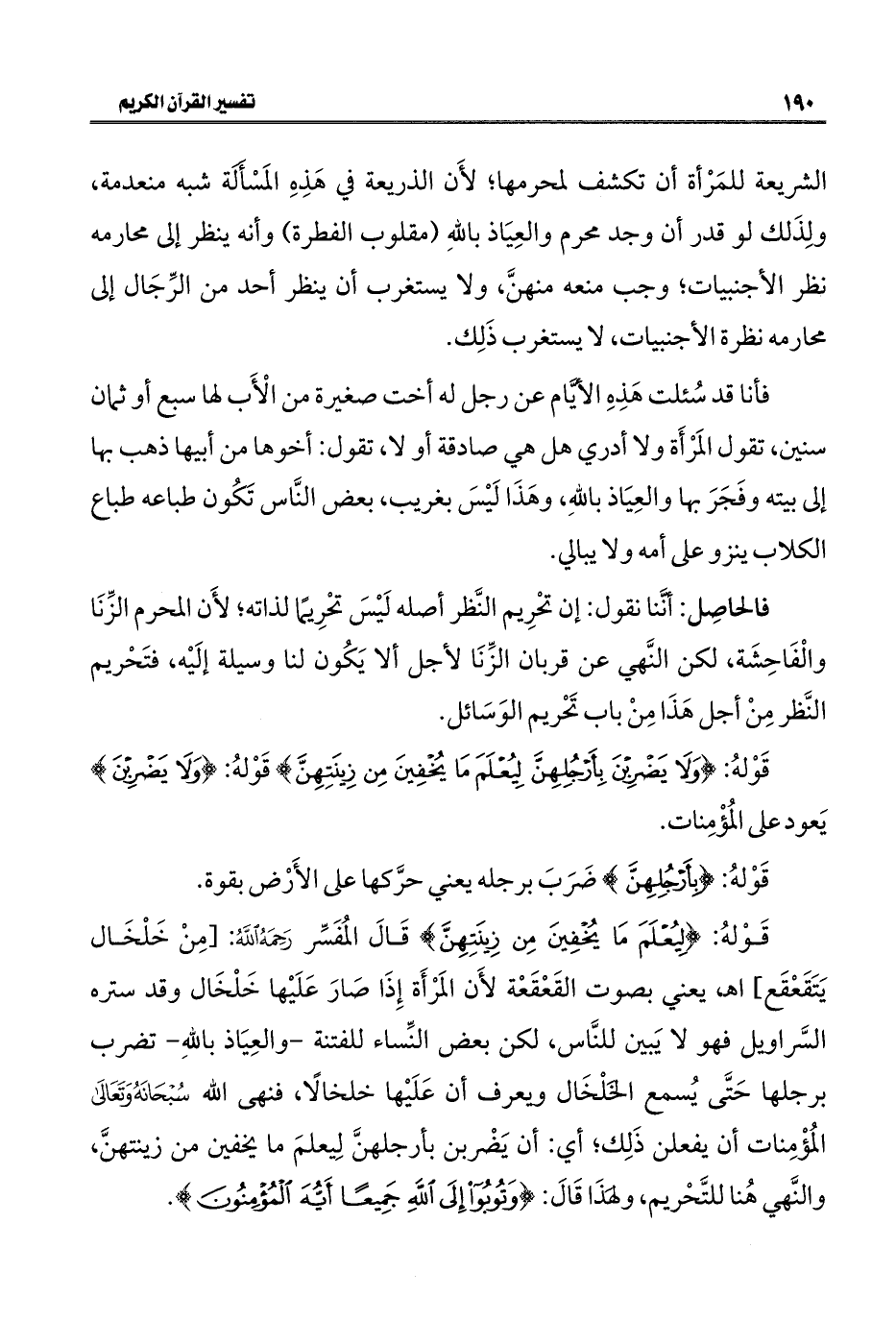 قَوْلهُ: {وَلَا يَضْرِبْنَ بِأَرْجُلِهِنَّ لِيُعْلَمَ مَا يُخْفِينَ مِنْ زِينَتِهِنَّ} قَوْلهُ: {وَلَا يَضْرِبْنَ} يَعود على المُؤْمِنات.