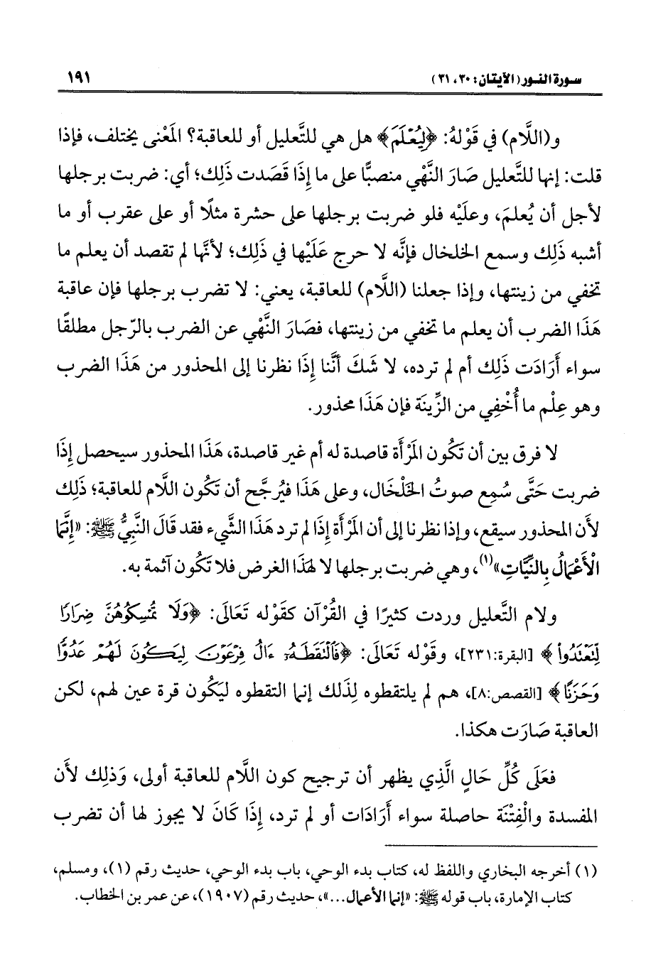 لا فرق بين أن تَكُون المَرْأَة قاصدة له أم غير قاصدة، هَذَا المحذور سيحصل إِذَا ضربت حَتَّى سُمِع صوتُ الخَلْخَال، وعلى هَذَا فيُرجَّح أن يمُون اللَّام للعاقبة، ذَلِك لأَن المحذور سيقع، وإذا نظرنا إلى أن المَرْأَة إِذَا لم ترد هَذَا الشَّيء فقد قَالَ النَّبِيُّ - صلى الله عليه وسلم -: "إِنَّمَا الْأَعْمَالُ بِالنياتِ" (¬١)، وهي ضربت برجلها لا لهَذَا الغرض فلا تَكُون آثمة به.