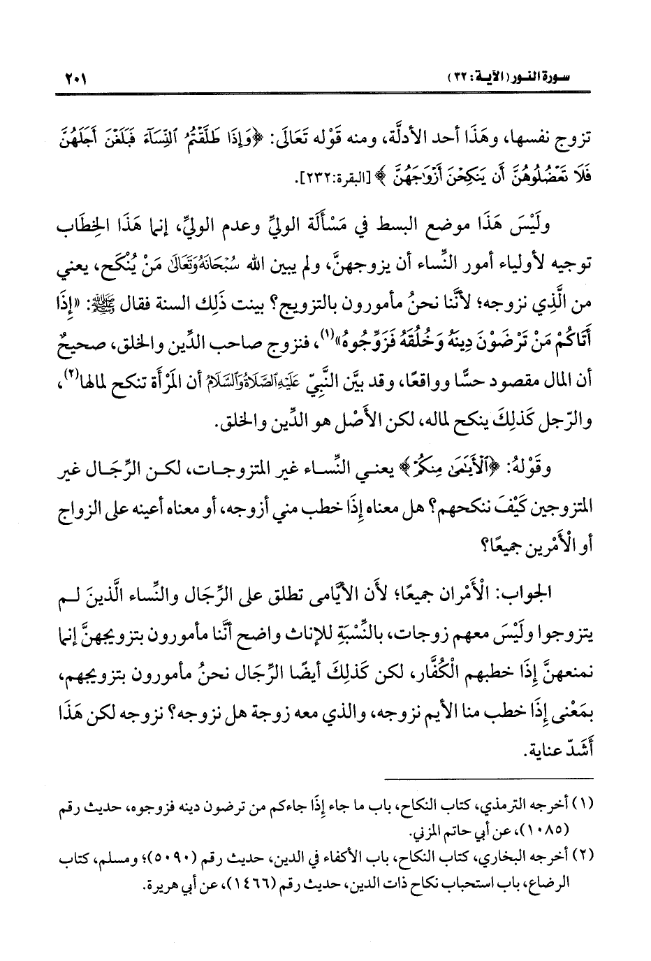 ولَيْسَ هَذَا موضع البسط في مَسْأَلَة الوليِّ وعدم الوليِّ، إنما هَذَا الخِطَاب توجيه لأولياء أمور النِّساء أن يزوجهنَّ، ولم يبين الله سُبْحَانَهُ وَتَعَالَى مَنْ يُنْكَح، يعني من الَّذِي نزوجه؛ لأنَّنا نحنُ مأمورون بالتزويج؟ بينت ذَلِك السنة فقال - صلى الله عليه وسلم -: "إِذَا أَتَاكُمْ مَنْ تَرْضَوْنَ دِينَهُ وَخُلُقَهُ فَزَوِّجُوهُ" (¬١)، فنزوج صاحب الدِّين والخلق، صحيحٌ أن المال مقصود حسًّا وواقعًا، وقد بيَّن النَّبِيّ عَلَيْهِ الصَّلَاةُ وَالسَّلَامُ أن المَرْأَة تنكح لمالها (¬٢)، والرّجل كَذلِكَ ينكح لماله، لكن الأَصْل هو الدِّين والخلق.