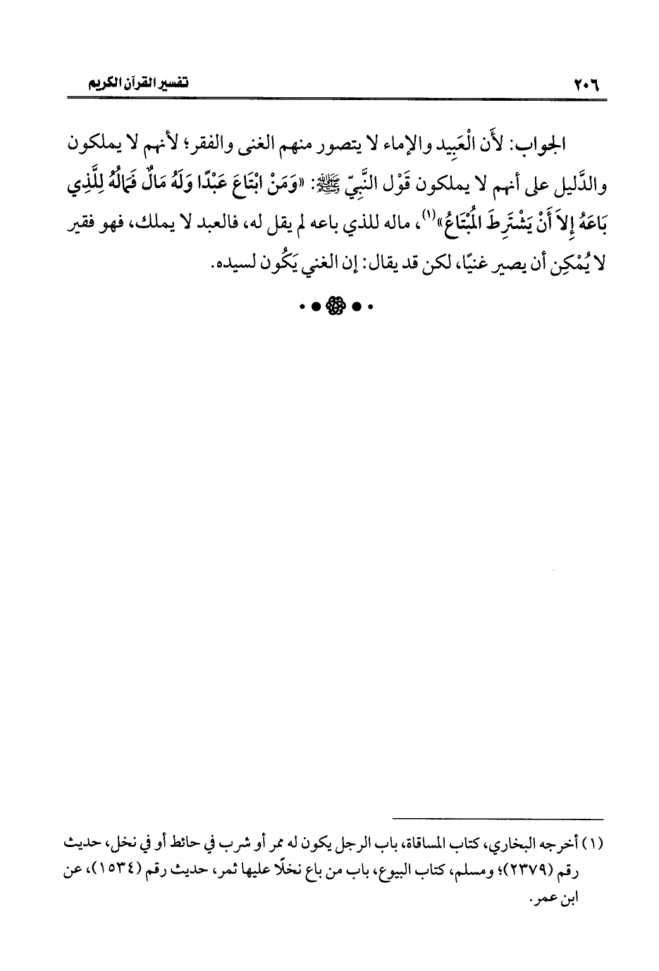 (¬١) أخرجه البخاري، كتاب المساقاة، باب الرجل يكون له ممر أو شرب في حائط أو في نخل، حديث رقم (٢٣٧٩)؛ ومسلم، كتاب البيوع، باب من باع نخلًا عليها ثمر، حديث رقم (١٥٣٤)، عن ابن عمر.