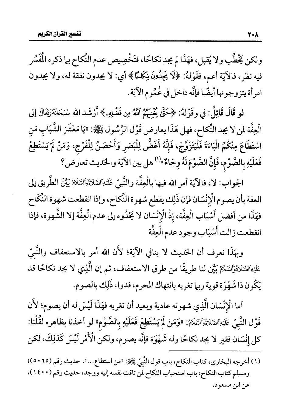 لو قَالَ قَائِلٌ: في وقَوْلهُ: {حَتَّى يُغْنِيَهُمُ اللَّهُ مِنْ فَضْلِهِ} أَرْشَد الله سبحانه وَتَعَالى إلى الْعِفَّة لمن لا يجد النكّاح، فهل هَذَا يعارض قَوْل الرَّسُول - صلى الله عليه وسلم -: "يَا مَعْشَرَ الشَّبَابِ مَنِ اسْتَطَاعَ مِنْكُمُ الْبَاءَةَ فَلْيَتَزَوَّجْ، فَإنَّهُ أَغَضُّ لِلْبَصَرِ وَأَحْصَنُ لِلْفَرْجِ، وَمَنْ لَمْ يَسْتَطِعْ فَعَلَيْهِ بِالصَّوْمِ، فَإِنَّ الصَّوْمَ لَهُ وِجَاءٌ" (¬١) هل بين الآية والحديث تعارض؟