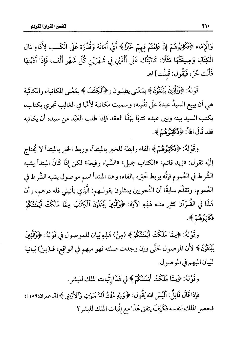 قَوْلهُ: {وَالَّذِينَ يَبْتَغُونَ} بمَعْنى يطلبون و {الْكِتَابَ} بمَعْنى المكاتبة، والمكاتَبة هي أن يبيع السيدُ عبدهَ علَى نفْسِه، وسميت مكاتبة لأنَّها في الغالِب تجري بكتاب، يكتب السيد بينه وبين عبده كتابًا بهَذَا العقد فإذا طلب العَبْد من سيده أن يكاتبه فقد قَالَ اللهُ: {فَكَاتِبُوهُمْ}.