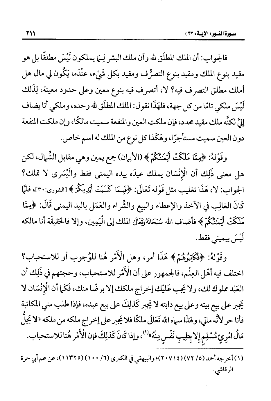 وقَوْلهُ: {فَكَاتِبُوهُمْ} هَذَا أمر، وهل الْأَمْر هُنا للوُجوب أو للاستحباب؟ اختلف فيه أهْل العِلْم، فالجمهور على أن الْأَمْر للاستحباب، وحجتهم في ذَلِك أن العَبْد مملوك لك، ولا يَجب عَليْك إخراج ملكك إلا برضًا منك، فكَما أن الْإِنْسَان لا يَجبر على بيع بيته وعلى بيع دابته لا يَجبر كَذلِكَ على بيع عبده، فإذا طلب مني المكاتبة فأنا حر لأنَّه مالي، ولهذَا سماه الله تَعَالَى ملكًا فلا يَجبر على إخراج ملكه من ملكه "لا يَحِلُّ مَالُ امْرِئٍ مُسْلِمٍ إِلا بِطِيبِ نَفْسٍ مِنْهُ" (¬١)، وإذا كَانَ كَذلِكَ فإن الْأَمْر هُنا للاستحباب.