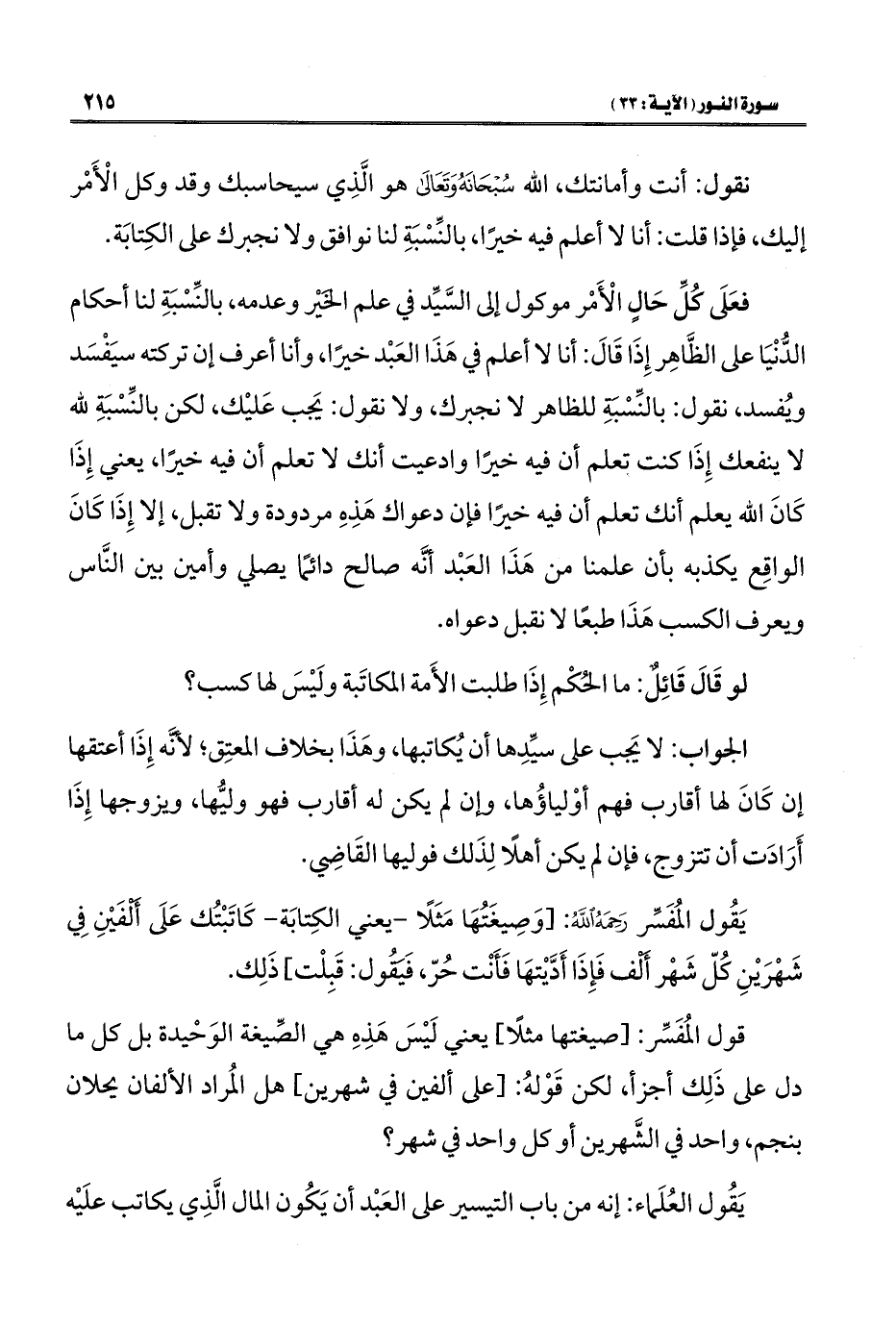 يَقُول المُفَسِّر رَحَمَهُ الله: [وَصِيغَتُهَا مَثَلًا -يعني الكِتابَة- كَاتَبْتُك عَلَى ألفَيْنِ فِي شَهْرَيْنِ كُلّ شَهْر ألف فَإِذَا أَدَّيْتهَا فَأَنْت حُرّ، فَتقُول: قَبِلْت] ذَلِك.
