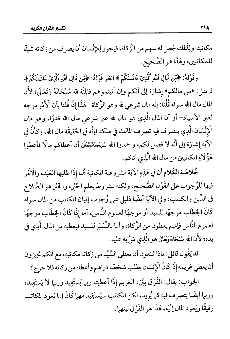 وقَوْلهُ: {مِنْ مَالِ اللَّهِ الَّذِي آتَاكُمْ} انظر قَوْلهُ: {مِنْ مَالِ اللَّهِ الَّذِي آتَاكُمْ} لم يقل: "من مالكم" إِشارَة إلى أنكم وإن آتيتموهم فالمِنّة لله سُبْحَانَهُ وَتَعَالَى؛ لأَن المال مال الله سواء قُلْنا: إنه مال شرعي لله وهو الزَّكاة -هَذَا إِذَا قُلْنا بأن الْأَمْر موجه لغير الأسياد- أو أن المال الَّذِي هو مال لله غير شرعي مال الله قدرًا، وهو مال الْإِنْسَان الَّذِي يتصرف فيه تصرف المالك في ملكه فإنَّه في الحَقيقَة مال الله، وكأنَّ في الآية إِشارَة إلى أنه لا فضل لكم، واحمدوا الله سبحانه وَتَعَالى أن أعطاكم مالًا فأعطوا هَؤُلَاءِ المكاتبين من مال الله الَّذِي آتاكم.