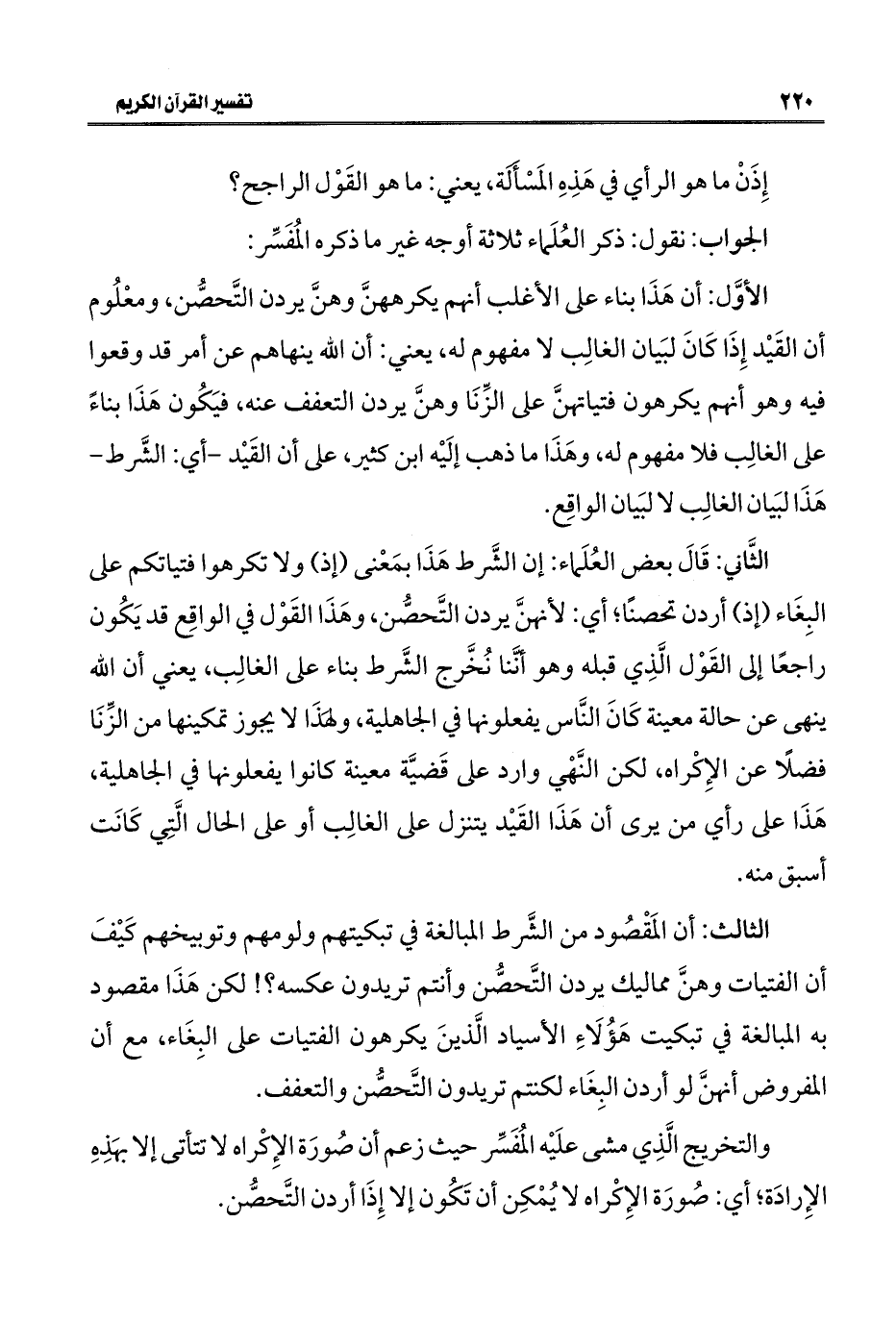 الثَّاني: قَالَ بعض العُلَماء: إن الشَّرط هَذَا بمَعْنى (إذ) ولا تكرهوا فتياتكم على البِغَاء (إذ) أردن تحصنًا؛ أي: لأنهنَّ يردن التَّحصُّن، وهَذَا القَوْل في الواقِع قد يَكُون راجعًا إلى القَوْل الَّذِي قبله وهو أننا نُخَّرج الشَّرط بناء على الغالِب، يعني أن الله ينهى عن حالة معينة كَانَ النَّاس يفعلونها في الجاهلية، ولهذَا لا يجوز تمكينها من الزِّنَا فضلًا عن الإِكْراه، لكن النَّهْي وارد على قَضيَّة معينة كانوا يفعلونها في الجاهلية، هَذَا على رأي من يرى أن هَذَا القَيْد يتنزل على الغالِب أو على الحال الَّتِي كَانَت أسبق منه.