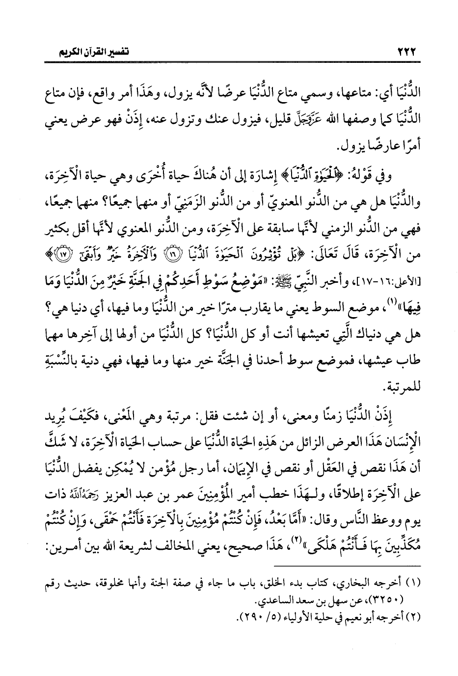 إِذَنْ الدُّنْيَا زمنًا ومعنى، أو إن شئت فقل: مرتبة وهي المَعْنى، فكَيْفَ يُرِيد الْإِنْسَان هَذَا العرض الزائل من هذه الحَياة الدُّنْيَا على حساب الحياة الْآخِرَة، لا شَكَّ أن هَذَا نقص في العَقْل أو نقص في الإِيمَان، أما رجل مُؤْمن لا يُمْكِن يفضل الدُّنْيَا على الْآخِرَة إطلاقًا، ولهَذَا خطب أمير المُؤْمِنِينَ عمر بن عبد العزيز رَحَمَهُ الله ذات يوم ووعظ النَّاس وقال: "أَمَّا بَعْدُ، فَإِنْ كُنْتُمْ مُؤْمِنِينَ بِالْآخِرَة فَأَنْتُمْ حَمْقَى، وَإِنْ كُنْتُمْ مُكَذِّبِينَ بِهَا فَأَنْتُمْ هَلْكَى" (¬٢)، هَذَا صحيح، يعني المخالف لشريعة الله بين أمرين: