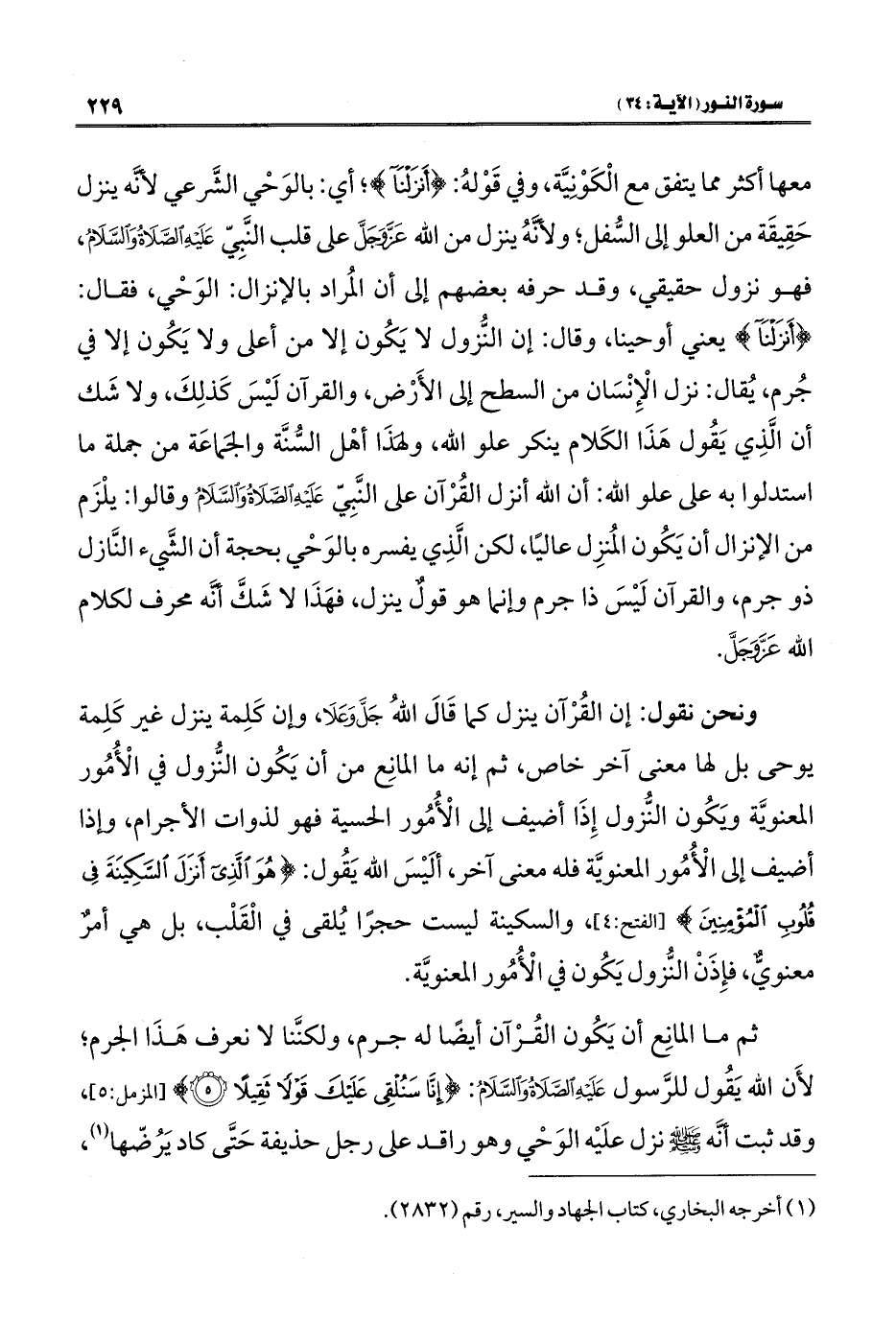 ونحن نقول: إن القُرْآن ينزل كما قَالَ اللهُ جَلَّ وَعَلَا، وإن كَلِمة ينزل غير كَلِمة يوحى بل لها معنى آخر خاص، ثم إنه ما المانِع من أن يَكُون النُّزول في الْأُمُور المعنويَّة وَيكُون النُّزول إِذَا أضيف إلى الْأُمُور الحسية فهو لذوات الأجرام، وإذا أضيف إلى الْأُمُور المعنويَّة فله معنى آخر، ألَيْسَ الله يَقُول: {هُوَ الَّذِي أَنْزَلَ السَّكِينَةَ فِي قُلُوبِ الْمُؤْمِنِينَ} [الفتح: ٤]، والسكينة ليست حجرًا يُلقى في الْقَلْب، بل هي أمرٌ معنويٌّ، فإِذَنْ النُّزول يَكُون في الْأُمُور المعنويَّة.