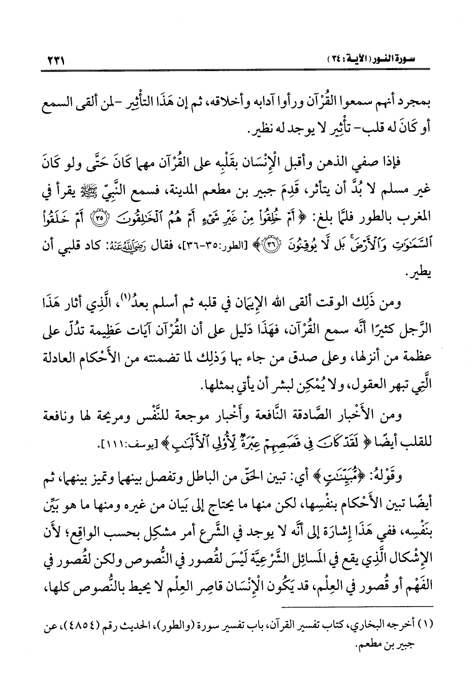 فإذا صفي الذهن وأقبل الْإِنْسَان بقَلْبِه على القُرْآن مهما كَانَ حَتَّى ولو كَانَ غير مسلم لا بُدَّ أن يتأثر، قَدِمَ جبير بن مطعم المدينة، فسمع النَّبِيّ - صلى الله عليه وسلم - يقرأ في المغرب بالطور فلمَّا بلغ: {أَمْ خُلِقُوا مِنْ غَيْرِ شَيْءٍ أَمْ هُمُ الْخَالِقُونَ (٣٥) أَمْ خَلَقُوا السَّمَاوَاتِ وَالْأَرْضَ بَلْ لَا يُوقِنُونَ (٣٦)} [الطور: ٣٥، ٣٦]، فقال - رضي الله عنه -: كاد قلبي أن يطير.