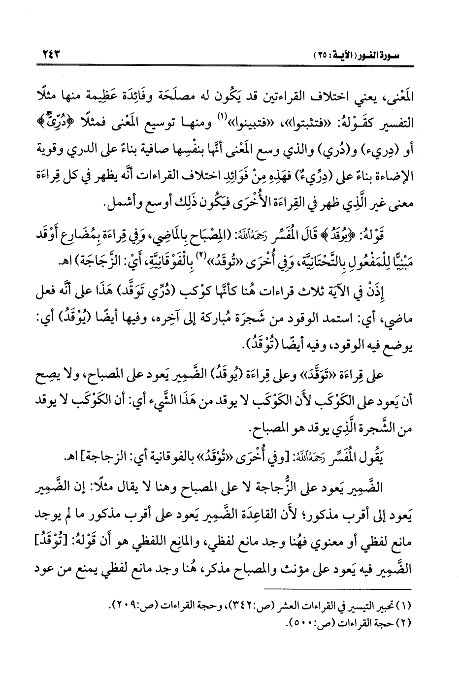 يَقُول المُفَسِّر رَحَمَهُ الله: [وفي أُخْرَى "تُوْقَدُ" بالفوقانية أي: الزجاجة] اهـ.