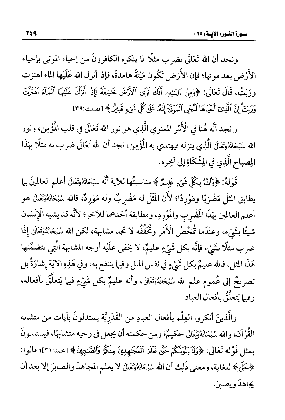 ونجد أنه هُنا في الْأَمْر المعنوي الَّذِي هو نور الله تَعَالَى في قلب المُؤْمِن، ونور الله سبحانه وَتَعَالى الَّذِي ينزله فيهتدي به المُؤْمِن، نجد أن الله تَعَالَى ضرب به مثلًا بهَذَا المِصباح الَّذِي في المِشْكَاةِ إلى آخِره.
