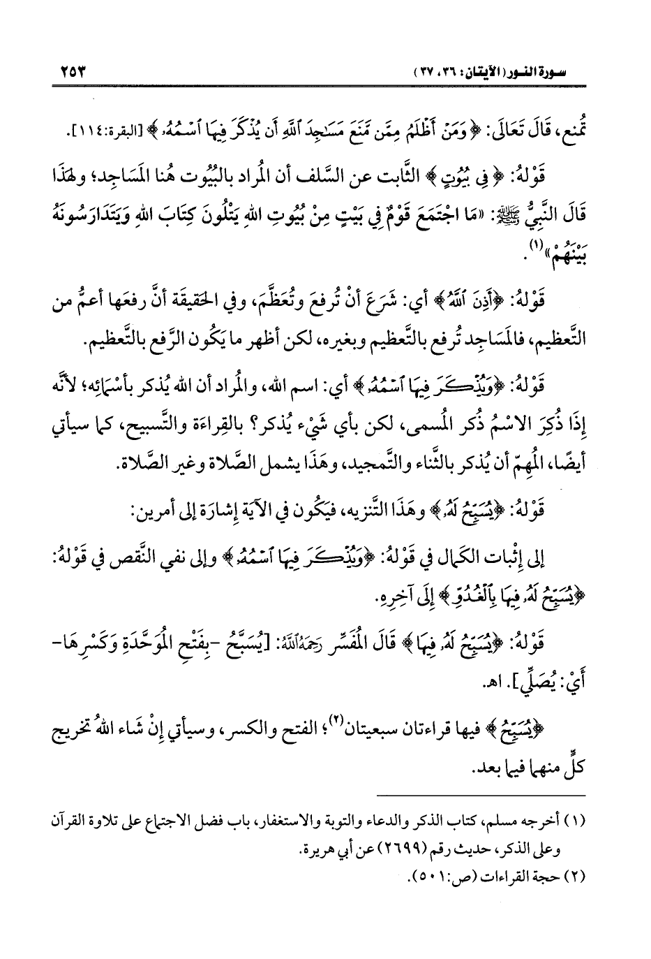 قَوْلهُ: {فِى بيُوُتٍ} الثَّابت عن السَّلف أن المُراد بالبُيُوت هُنا المَسَاجِد، ولِهَذَا قَالَ النَّبِيُّ - صلى الله عليه وسلم -: "مَا اجْتَمَعَ قَوْمٌ فِي بَيْتٍ مِنْ بُيُوتِ اللهِ يَتْلُونَ كِتَابَ اللهِ وَيَتَدَارَسُونَهُ بَيْنَهُمْ" (¬١).