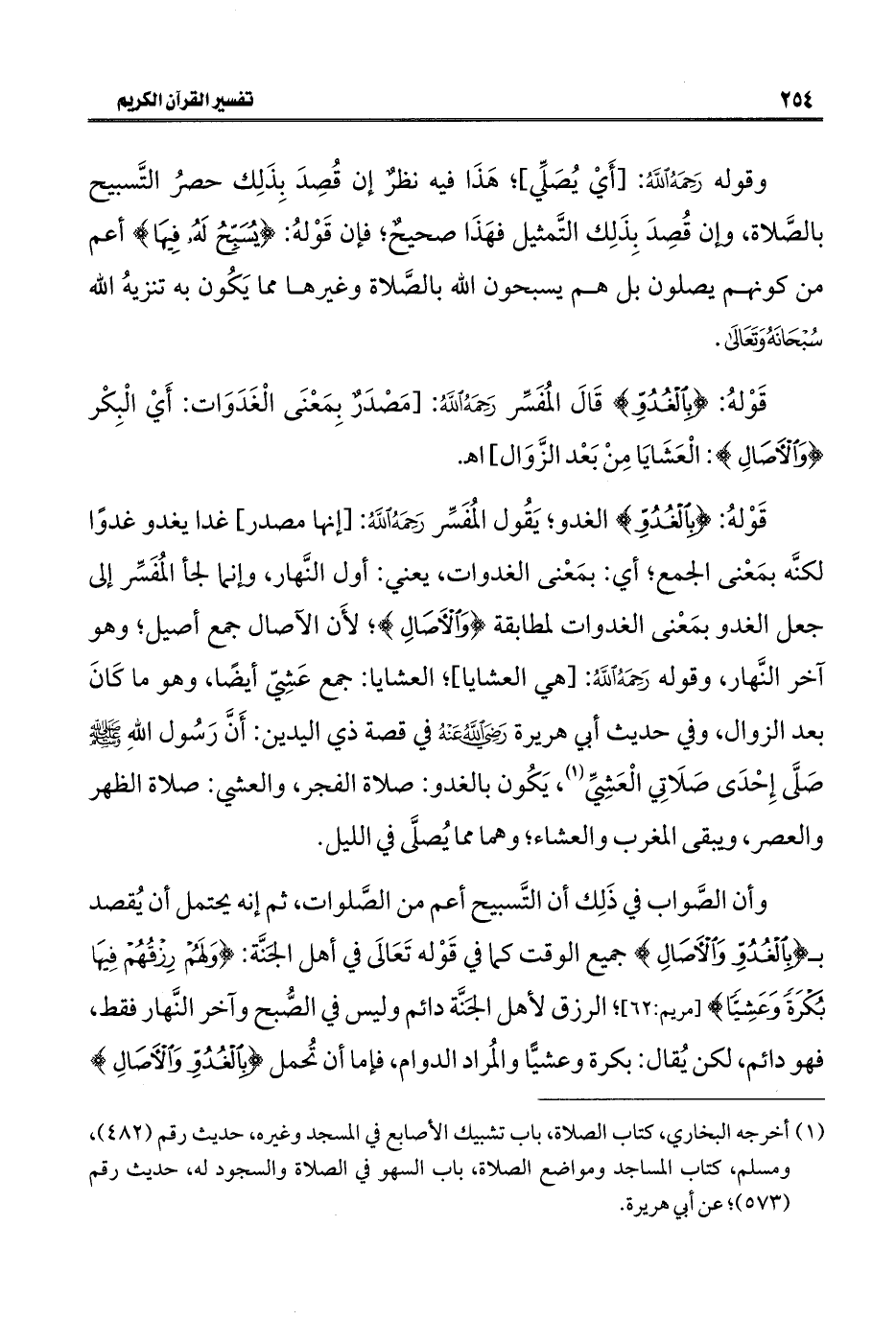 قَوْلهُ: {بِالْغُدُوِّ} الغدو؛ يَقُول المُفَسِّر رَحَمَهُ اللَّهُ: [إنها مصدر، غدا يغدو غدوًا لكنَّه بمَعْنى الجمع؛ أي: بمَعْنى الغدوات، يعني: أول النَّهار، وإنَّما لجأ المُفَسِّر إلى جعل الغدو بمَعْنى الغدوات لمطابقة {وَالْآصَالِ}؛ لأَن الآصال جمع أصيل؛ وهو آخر النَّهار، وقوله رَحَمَهُ اللَّهُ: [هي العشايا]؛ العشايا: جمع عَشِيّ أيضًا، وهو ما كَانَ بعد الزوال، وفي حديث أبي هريرة - رضي الله عنه - في قصة ذي اليدين: أَنَّ رَسُول اللهِ - صلى الله عليه وسلم - صَلَّى إِحْدَى صَلَاتِي الْعَشِيِّ (¬١)، يَكُون بالغدو: صلاة الفجر، والعشي: صلاة الظهر والعصر، ويبقى المغرب والعشاء؛ وهما مما يُصلَّى في الليل.