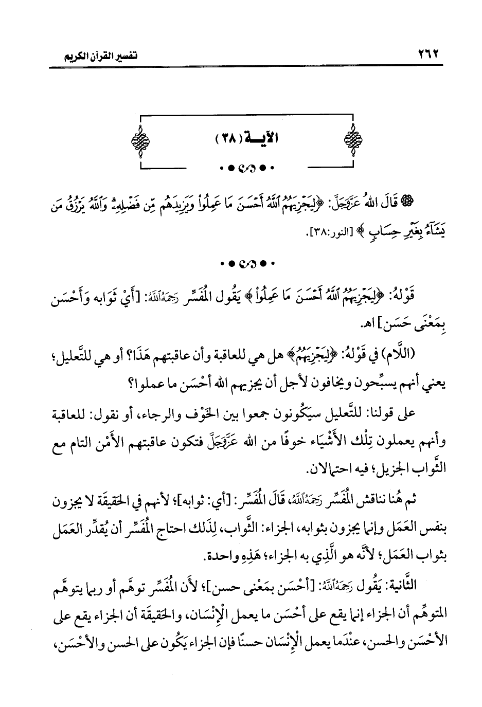 الثَّانية: يَقُول رَحَمَهُ اللَّهُ: [أحْسَن بمَعْنى حسن]؛ لأَن المُفَسِّر توهَّم أو ربما يتوهَّم المتوهِّم أن الجزاء إنما يقع على أحْسَن ما يعمل الْإِنْسَان، والحقيقَة أن الجزاء يقع على الأحْسَن والحسن، عنْدَما يعمل الْإِنْسَان حسنًا فإن الجزاء يَكُون على الحسن والأحْسَن،