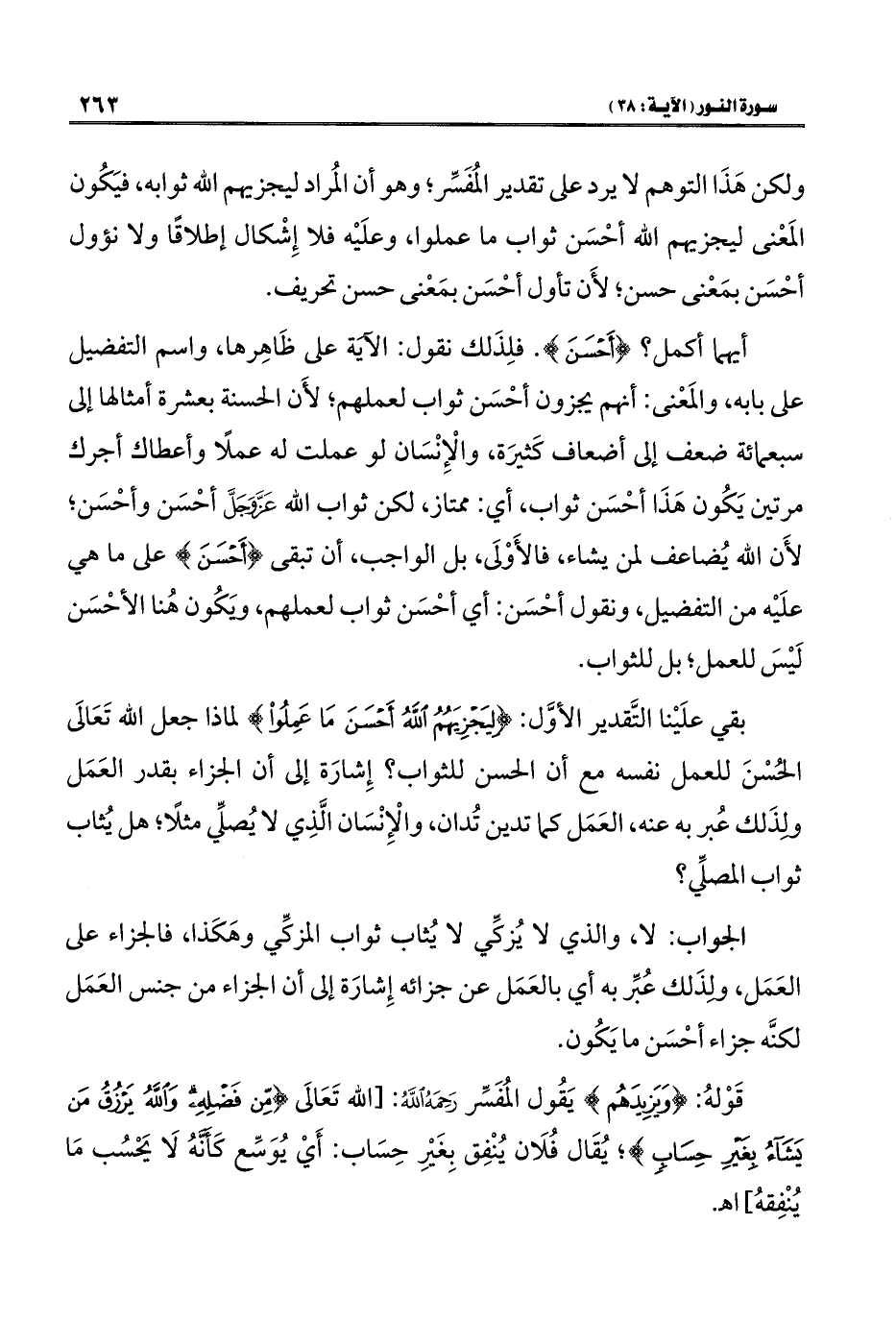 ولكن هَذَا التوهم لا يرد على تقدير المُفَسِّر، وهو أن المُراد ليجزيهم الله ثوابه، فيَكُون المَعْنى ليجزيهم الله أحْسَن ثواب ما عملوا، وعلَيْه فلا إِشْكال إطلاقًا ولا نؤول أحْسَن بمَعْنى حسن، لأَن تأول أحْسَن بمَعْنى حسن تحريف.